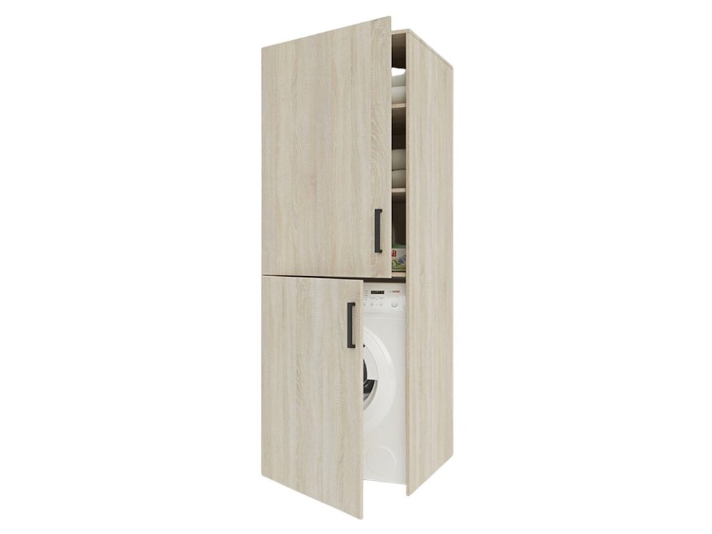 Zajímavě řešená skříňka na pračku představuje praktické řešení, jak využít úložný prostor nad pračkou a držet v něm čistící prostředky a koupelnové doplňky pěkně uspořádané v policích za dvířky mimo dohled.