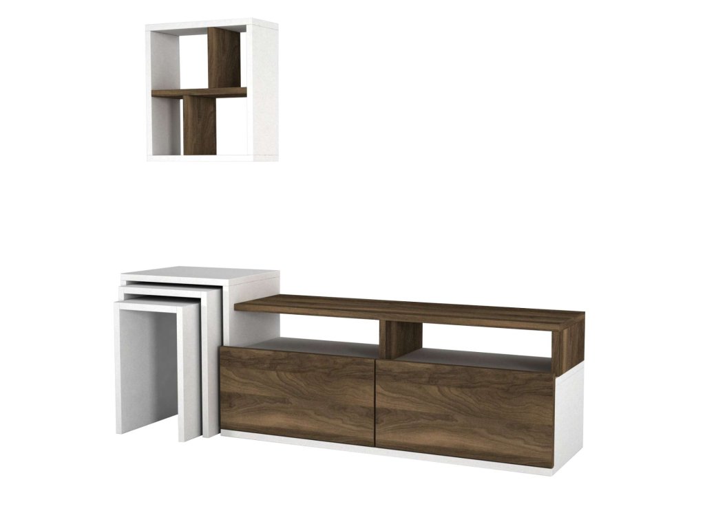 - Dodatečné informace: Odkládací stolky jsou vsunuty dovnitř TV stolku, což umožňuje efektivní využití prostoru. Produkt je dodáván v demontovaném stavu, což usnadňuje transport a montáž.