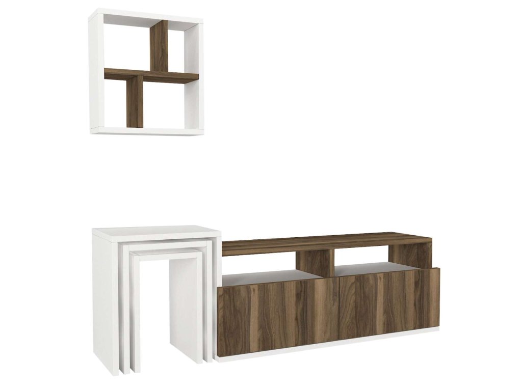Představujeme ELIOT, obývací stěnu, která přináší do vašeho obývacího pokoje elegantní a moderní design. Tato stylová sestava v kombinaci bílé a ořechové barvy je navržena tak, aby poskytovala praktické a estetické řešení pro vaše multimediální zařízení a další potřeby.