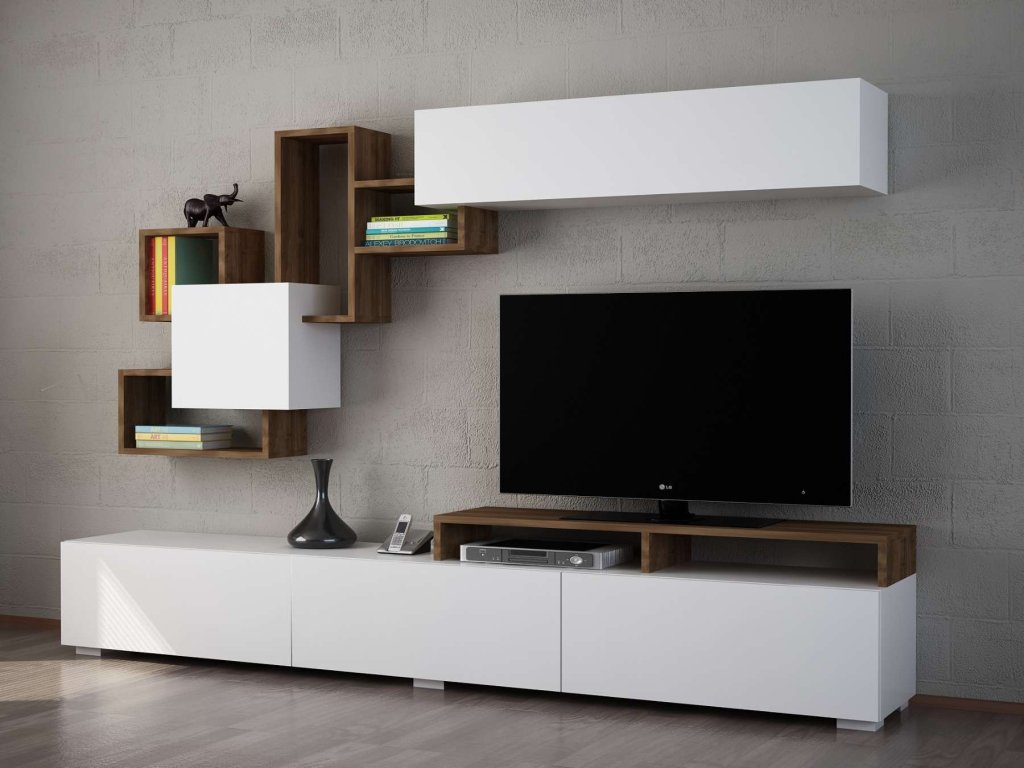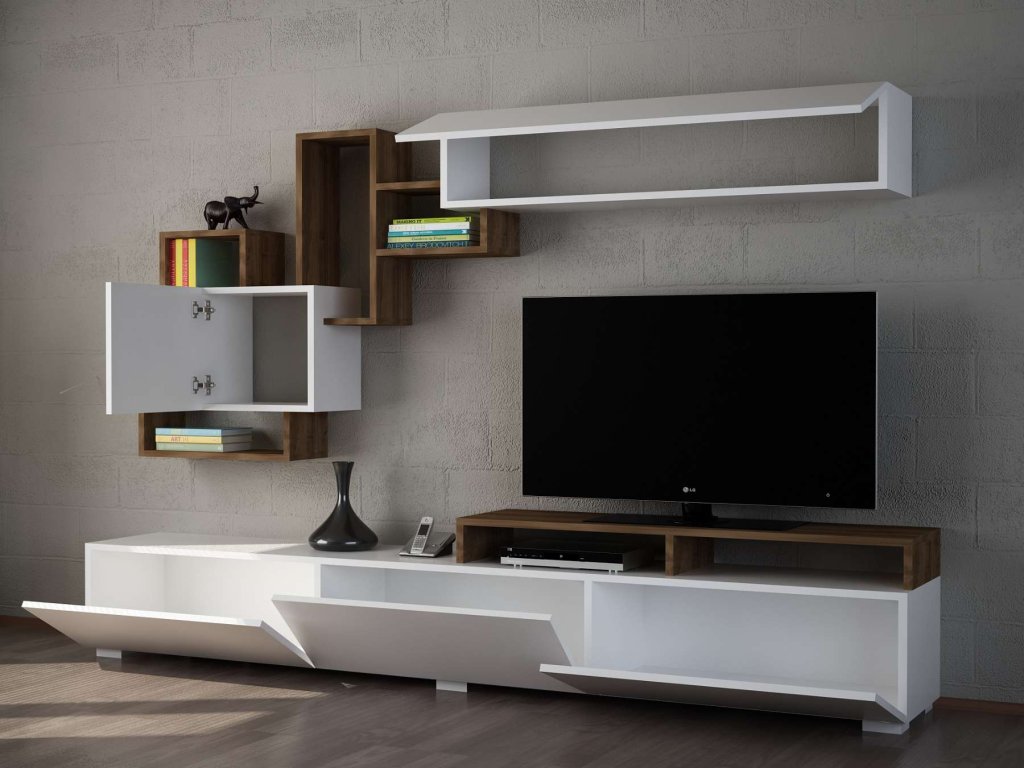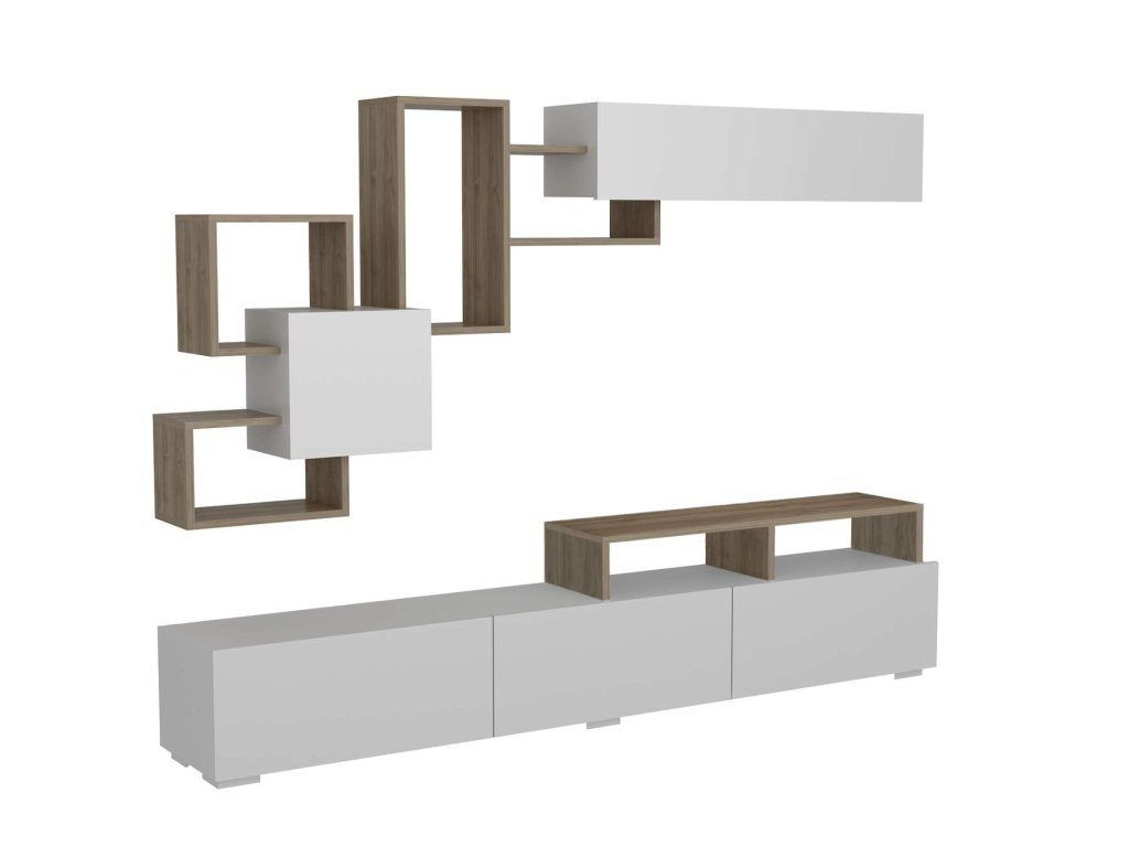 - Sestava obsahuje: TV stolek (210 x 36.8 x 46.8 cm) a nástěnnou polici (210 x 26.8 x 102.8 cm), což poskytuje úložný prostor pro elektroniku, knihy a dekorace.