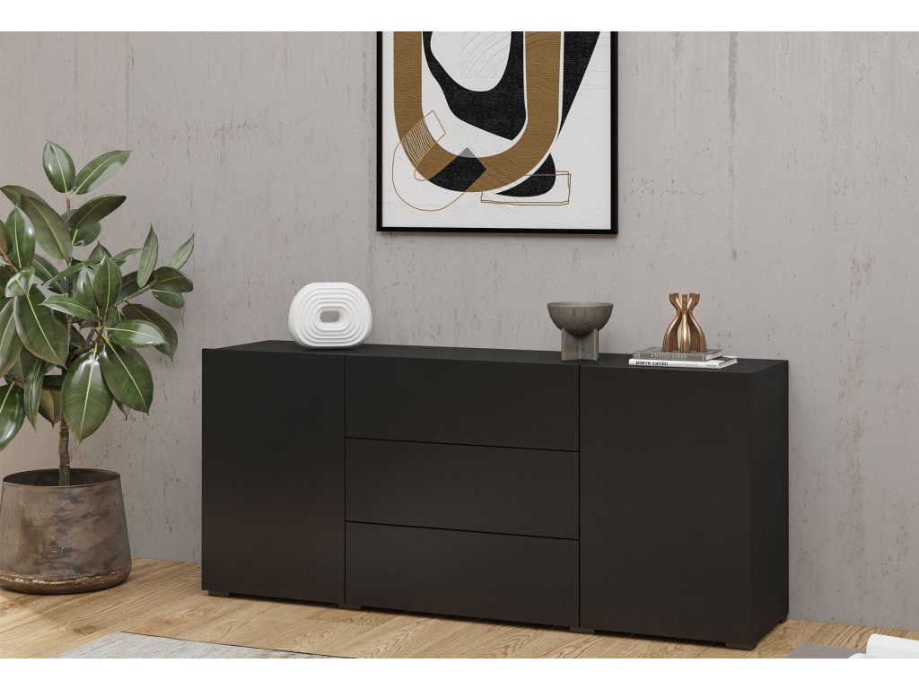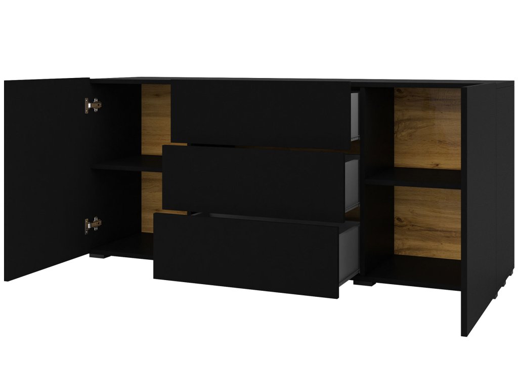Komoda EMMA 26 má po stranách dvoje dvířka za kterými jsou praktické police, které Vám poskytnou dostatek úložného prostoru a ve středu tři zásuvky.