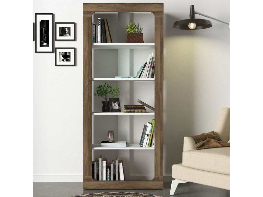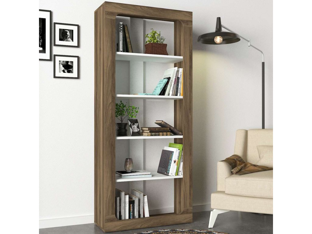 Regál ENTRES vyniká svým moderním a praktickým designem, který se skvěle hodí do jakéhokoliv interiéru. Čtyři pevné police poskytují dostatek úložného prostoru pro knihy, dekorace či kancelářské potřeby. Kombinace bílé a ořechové barvy dodává regálu elegantní vzhled. Robustní LTD materiál o tloušťce 18 mm zajišťuje dlouhou životnost a stabilitu tohoto regálu.