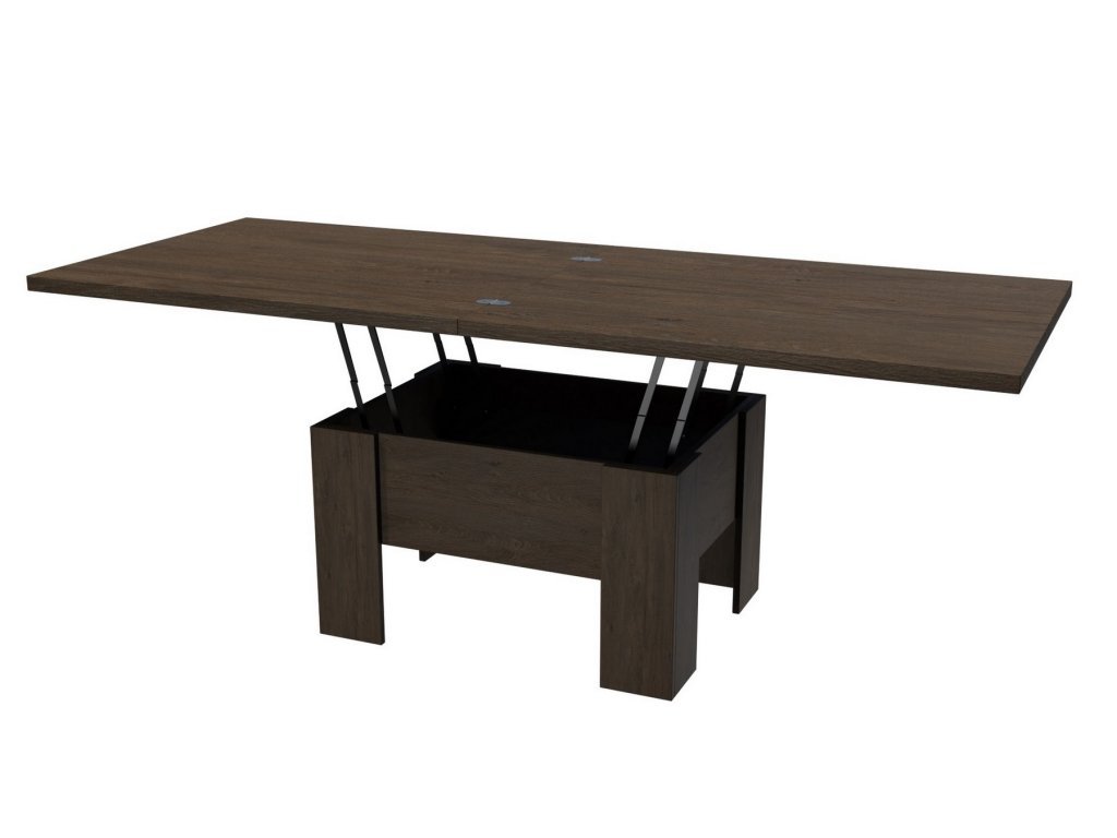 Elegantní konferenční stůl s funkcí jídelního stolu v moderním pojetí. Výhodou tohoto stolu je nastavitelná výška, kdy po zvýšení a rozkladu desky je možno ho použít ke stolování. Masivní deska je z LTD 32 mm opatřena ABS páskou 2 mm, otevírací mechanismus je vysoké kvality. Barevné provedení - jasan tmavý. Plocha před rozložením je 80 x 100 cm, po rozložení 80 x 200 cm. Výška se po rozkladu z 53 cm zvýší na 78 cm. Dodáváme v demontovaném stavu.Doplňkové parametry