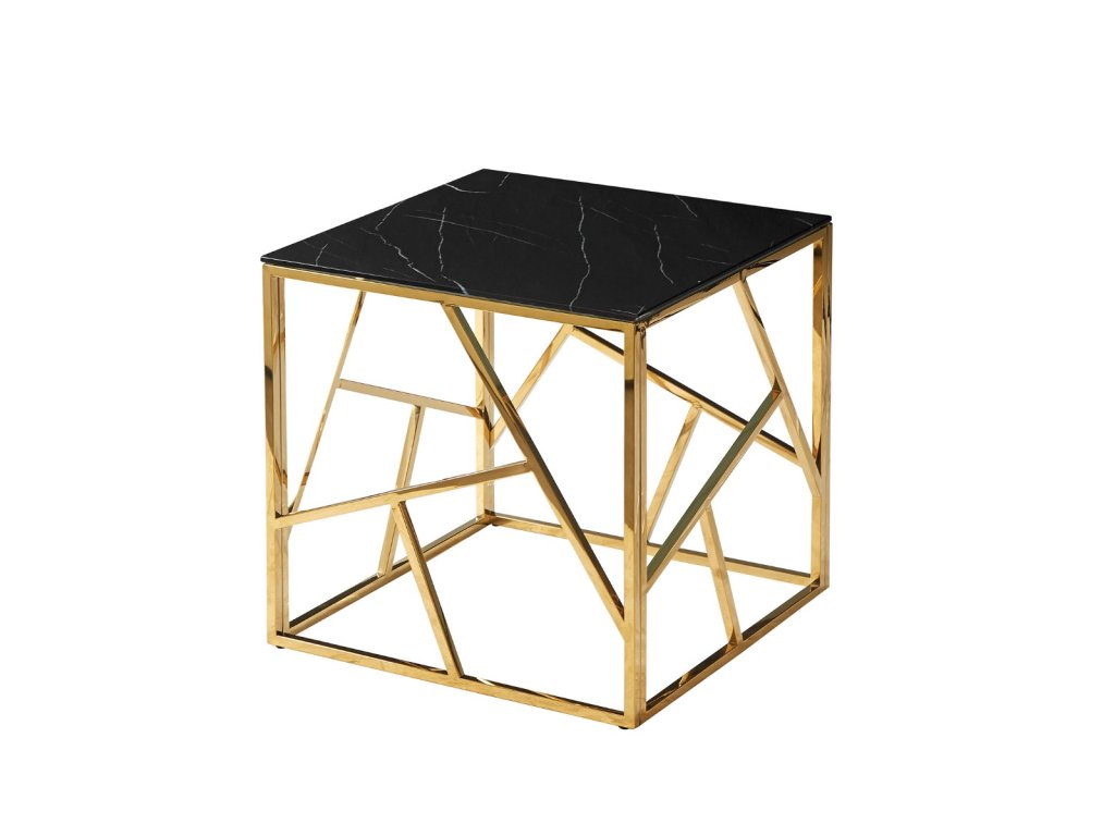 Konferenční stolek se hodí do interiérů zařízených v moderním stylu, jeho konstrukce je z nerezavějící oceli v atraktivní zlaté barvě, vrchní deska je vyrobena z tvrzeného skla v černé barvě s efektem mramoru.