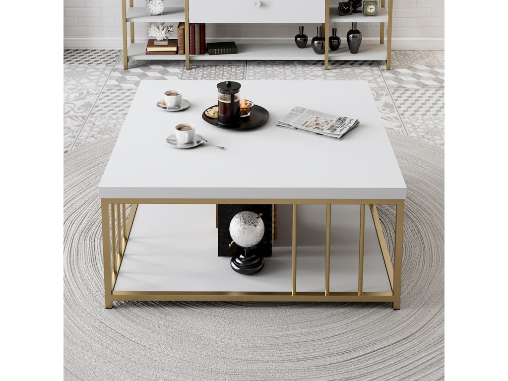 Dodejte svému domovu nádech lesku s tímto krásně vyrobeným konferenčním stolkem. Kombinace bílé a zlaté barvy vyzařuje luxus a opulentnost a vytváří elegantní a stylový vzhled, který ohromí vaše hosty a zanechá je v úžasu.