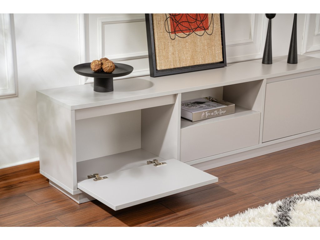 Proměňte svůj obývací pokoj ve stylový a organizovaný prostor s naším elegantním a moderním televizním stolkem. Tento televizní stolek není jen kus nábytku, ale ztělesnění elegance a sofistikovanosti. Jeho čisté linie a minimalistický design okamžitě pozvednou vzhled vaší zábavní zóny a udělají z ní ústřední bod místnosti.
