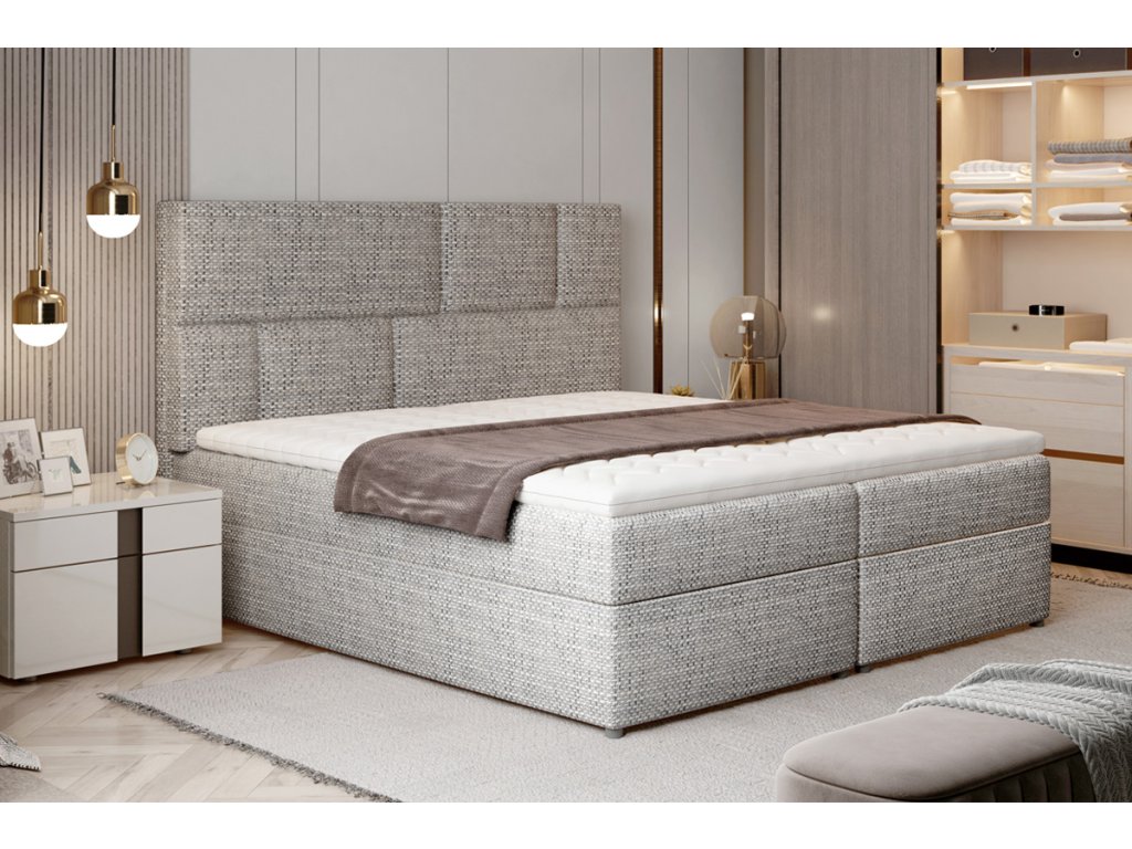 Moderní design postele je propojen s praktickým řešením prostoru. Postel nabízí spací plochu 185 x 200 cm, členěnou na dvě části. Pod každou z nich naleznete úložné boxy. Využívají UP systém otevírání, díky kterému se jednoduchým způsobem dostanete k předmětům uloženým v boxech. bonellové pružiny, kombinovaný s PUR pěnou T25. Pro ještě lepší pocit je součástí postele horní topper o výšce 4 cm. Potah je hypoalergenní, snímatelný a pratelný při 40 ℃. Postel je celočalouněná kvalitní látkou Berlin 01.