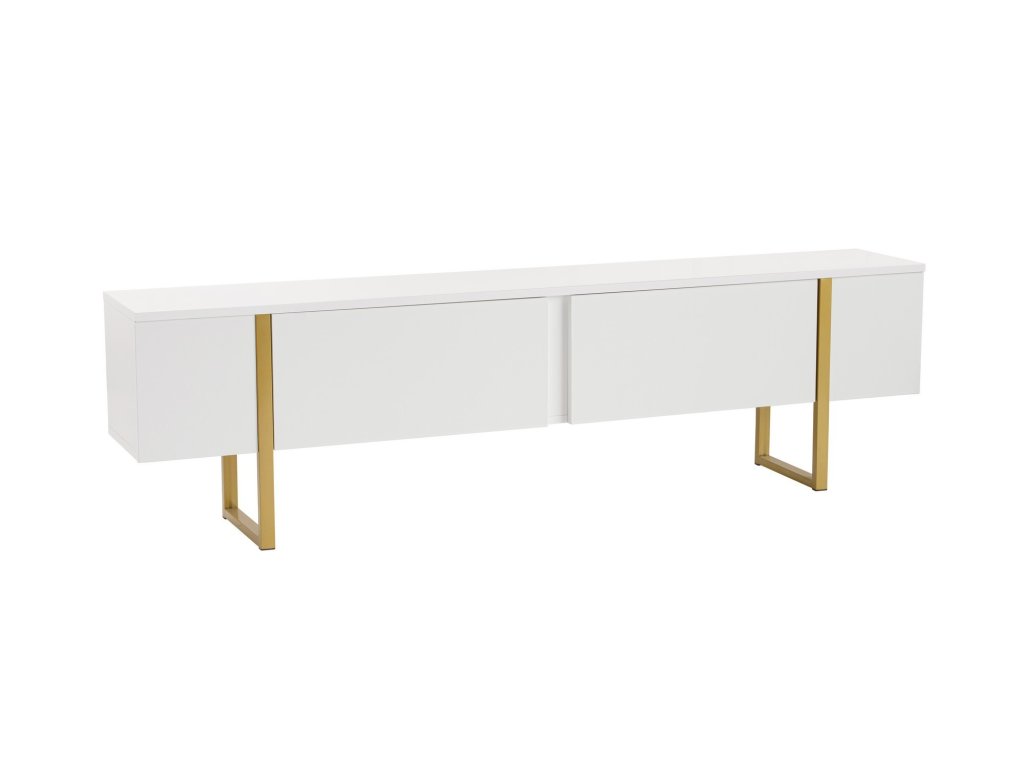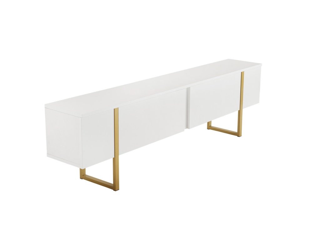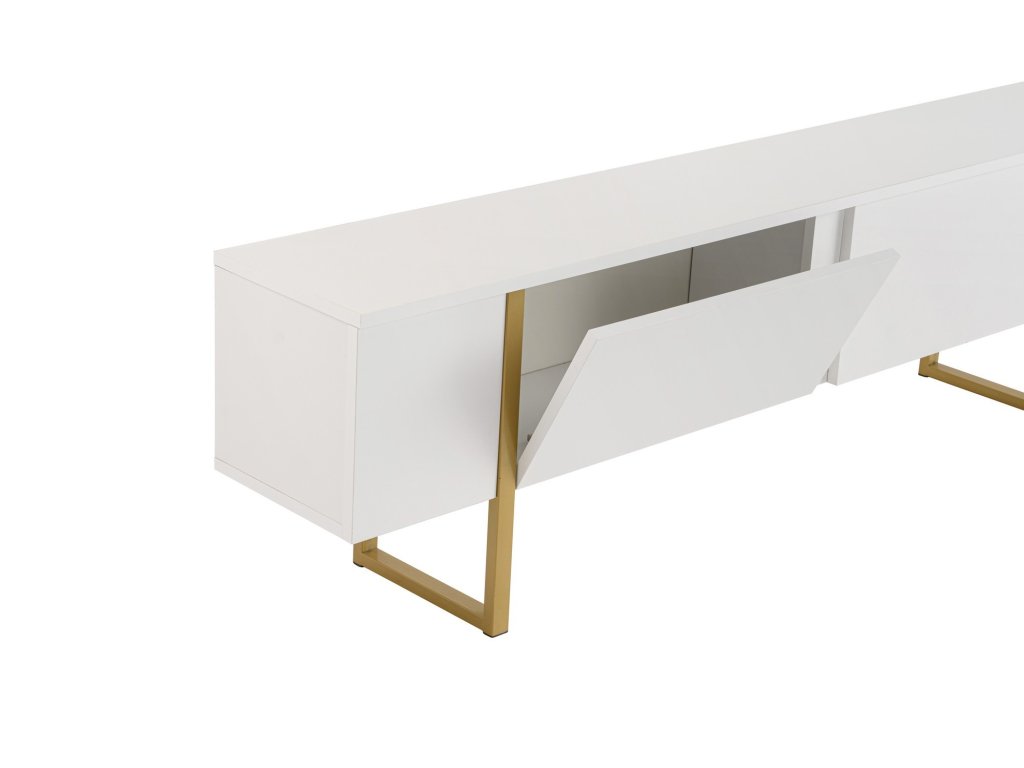 Proměňte svůj obývací pokoj v luxusní a elegantní prostor s naším úžasným televizním stolkem. Elegantní design a sofistikovaná barevná kombinace bílé a zlaté okamžitě pozvednou vzhled vašeho koutku pro zábavu.