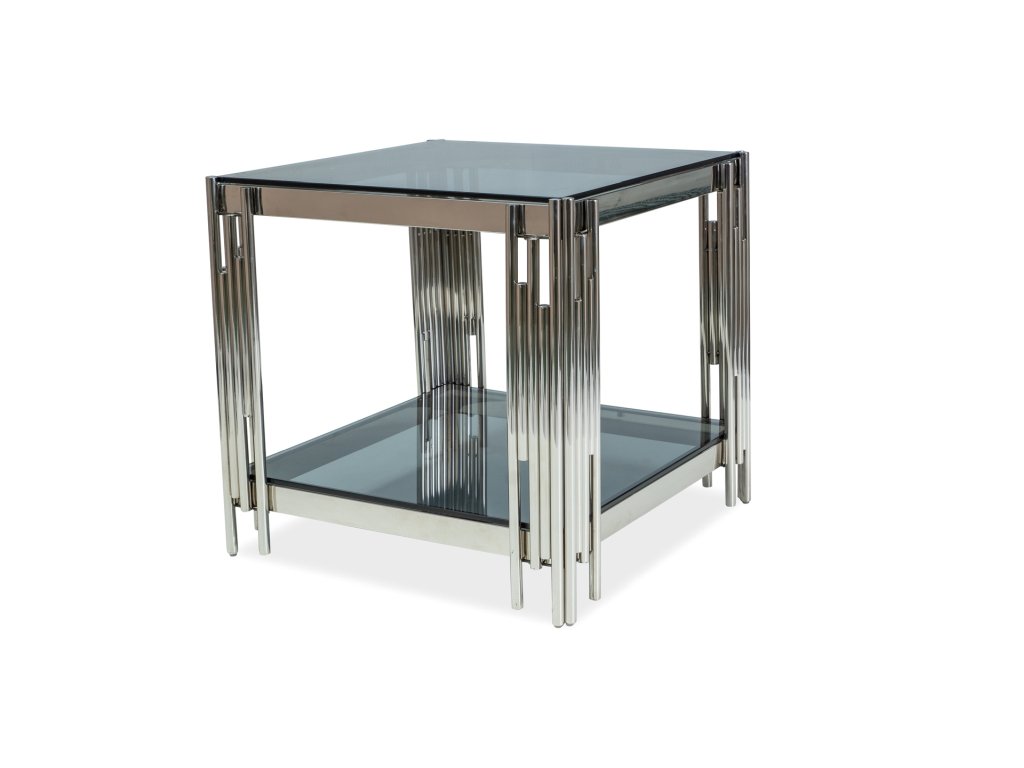 Moderní kovový konferenční stolek FASSIL netradičního stylu a designu. Nesmí chybět v žádném moderním interiéru, a proto neváhejte a doplňte svůj interiér tímto prvkem. Konstrukce je kovová v chromovém provedení, vrchní deska je vyrobena z tvrzeného kouřového skla. Rozměry (výška/šířka/hloubka v cm): 55/55/55. V tomto designu naleznete v naší nabídce i větší konferenční stolek a konzoli. Dodáváme v demontovaném stavu.Doplňkové parametry