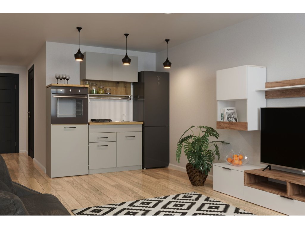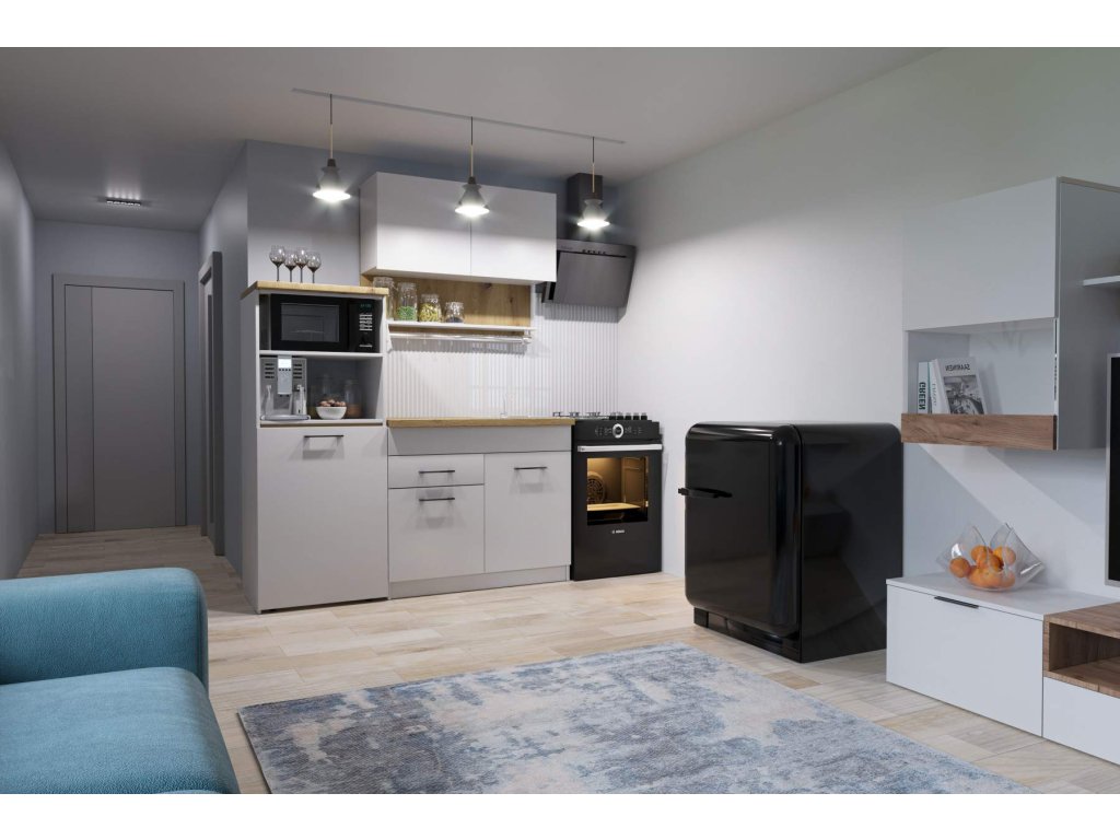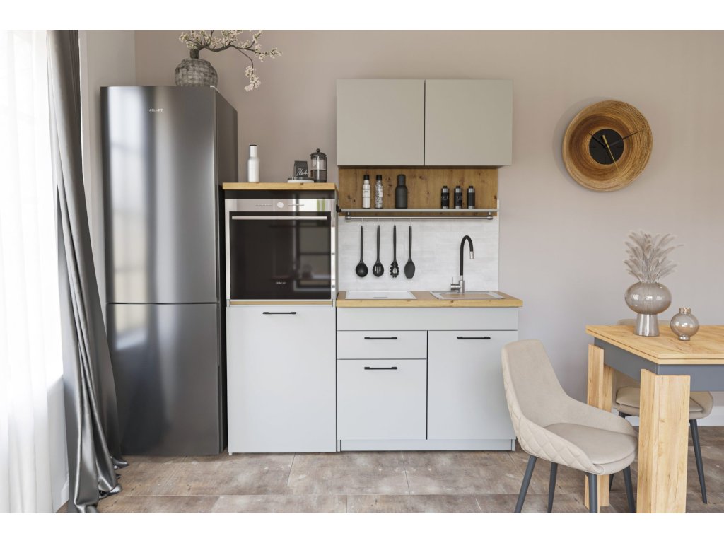 Kuchyňská linka FEEL 160 kombinuje moderní design s praktickým uspořádáním. Její závěsná skříňka s odkapávačem umožňuje efektivní sušení nádobí, zatímco skříňka s pracovní deskou poskytuje prostor pro přípravu jídla a uskladnění věcí. Multifunkční skříňka nabízí prostor pro mikrovlnku nebo troubu, což přidává další úroveň praktičnosti a pohodlí. Pro větší pohodlí a styl je součástí LED podsvícení.