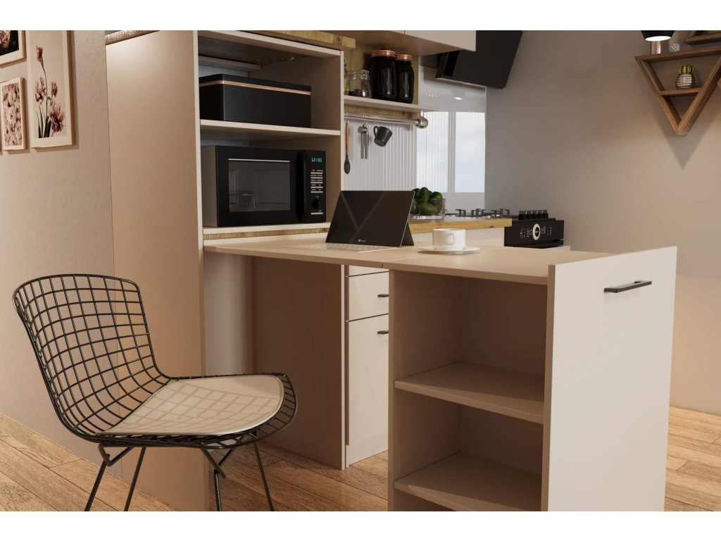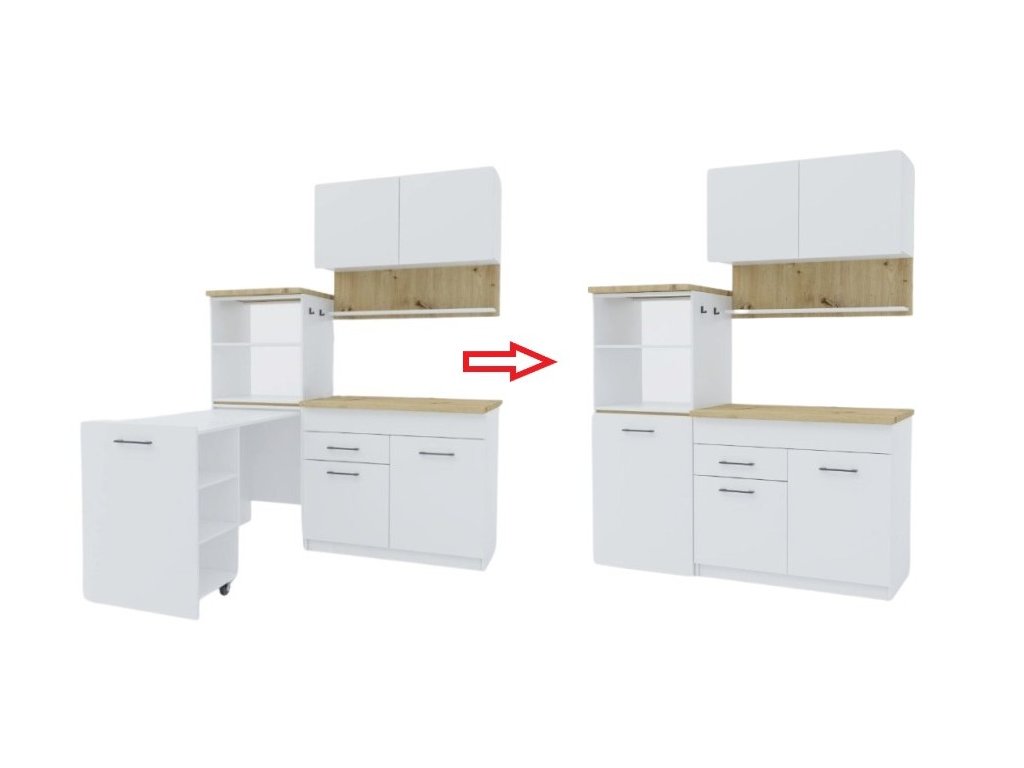 | Sestava obsahuje: | závěsnou skříňku - výška 76, hloubka 31,6 a šířka 100, multifunkční skříňka s výsuvným stolem - výška 147, hloubka 58 a šířka 60, dolní skříňka - výška 820, hloubka 58 a šířka 100 |
