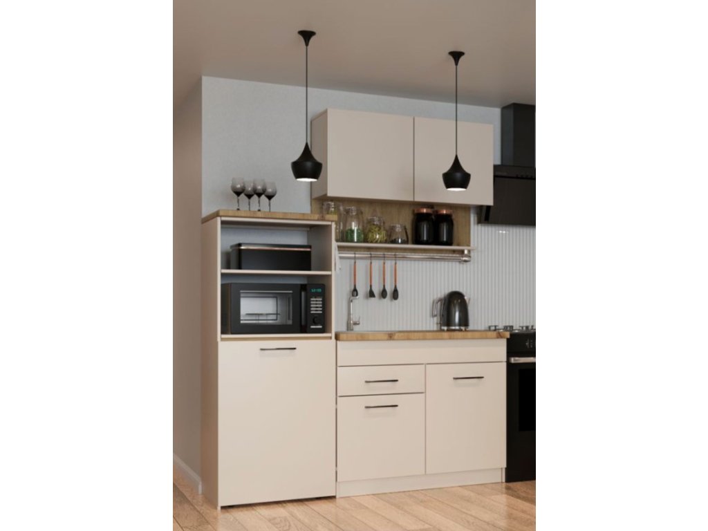 Kuchyňská linka FEEL 160 kombinuje moderní design s praktickým uspořádáním. Její závěsná skříňka s odkapávačem umožňuje efektivní sušení nádobí, zatímco skříňka s pracovní deskou poskytuje prostor pro přípravu jídla a uskladnění věcí. Multifunkční skříňka nabízí prostor pro mikrovlnku nebo troubu, což přidává další úroveň praktičnosti a pohodlí. Pro větší pohodlí a styl je součástí LED podsvícení.