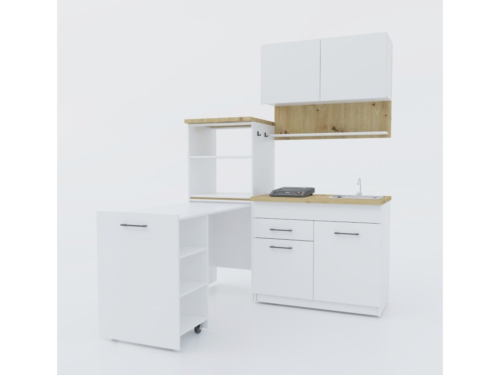 | Sestava obsahuje: | závěsnou skříňku - výška 76, hloubka 31,6 a šířka 100, multifunkční skříňka s výsuvným stolem - výška 147, hloubka 58 a šířka 60, skříňka s dřezem - výška 820, hloubka 58 a šířka 100 |
