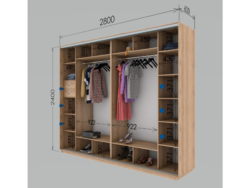 Zásuvky na obr. nejsou součástí šatní skříně, lze je doobjednat.