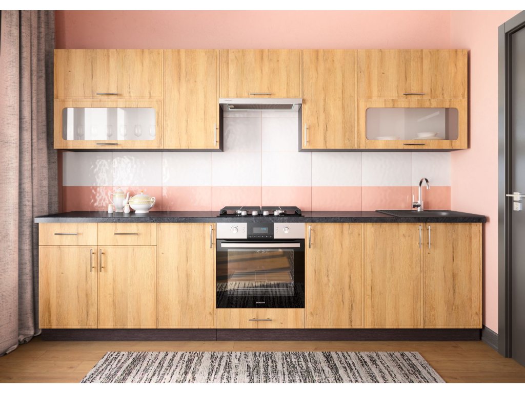| Sestava obsahuje: | 2 ks horní dvoudveřová skříňka s vitrínou 80 cm 2 ks horní jednodveřová skříňka 40 cm 1 ks digestořová skříňka 60 cm 1 dolní dvoudveřová dřezová skříňka 80 cm 2 ks dolní jednodveřová 40 cm 1 ks na troubu 60 cm 1 ks dolní dvoudveřová se zásuvkami 80 cm |
