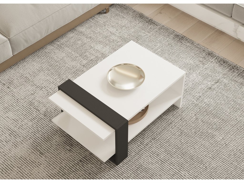 Díky svému elegantnímu a modernímu designu je tento konferenční stolek výrazným prvkem, který okamžitě zvýší estetickou přitažlivost vašeho domova. Kombinace antracitové a bílé barvy dodává nádech sofistikovanosti, díky čemuž se perfektně hodí do jakéhokoli interiéru.