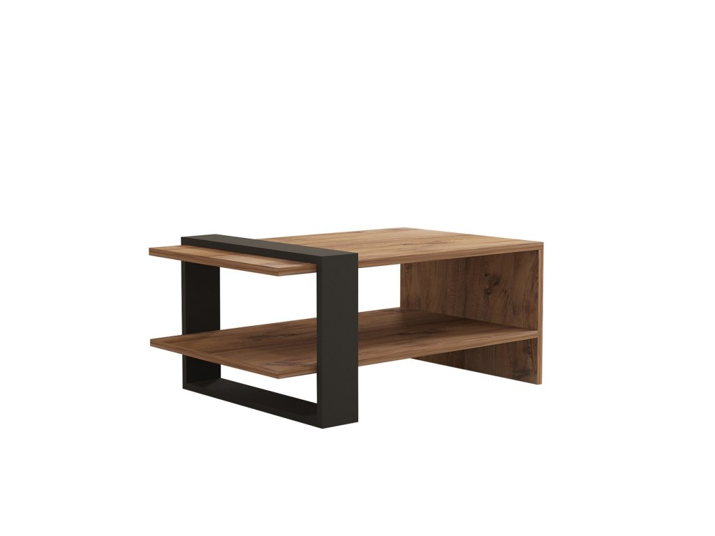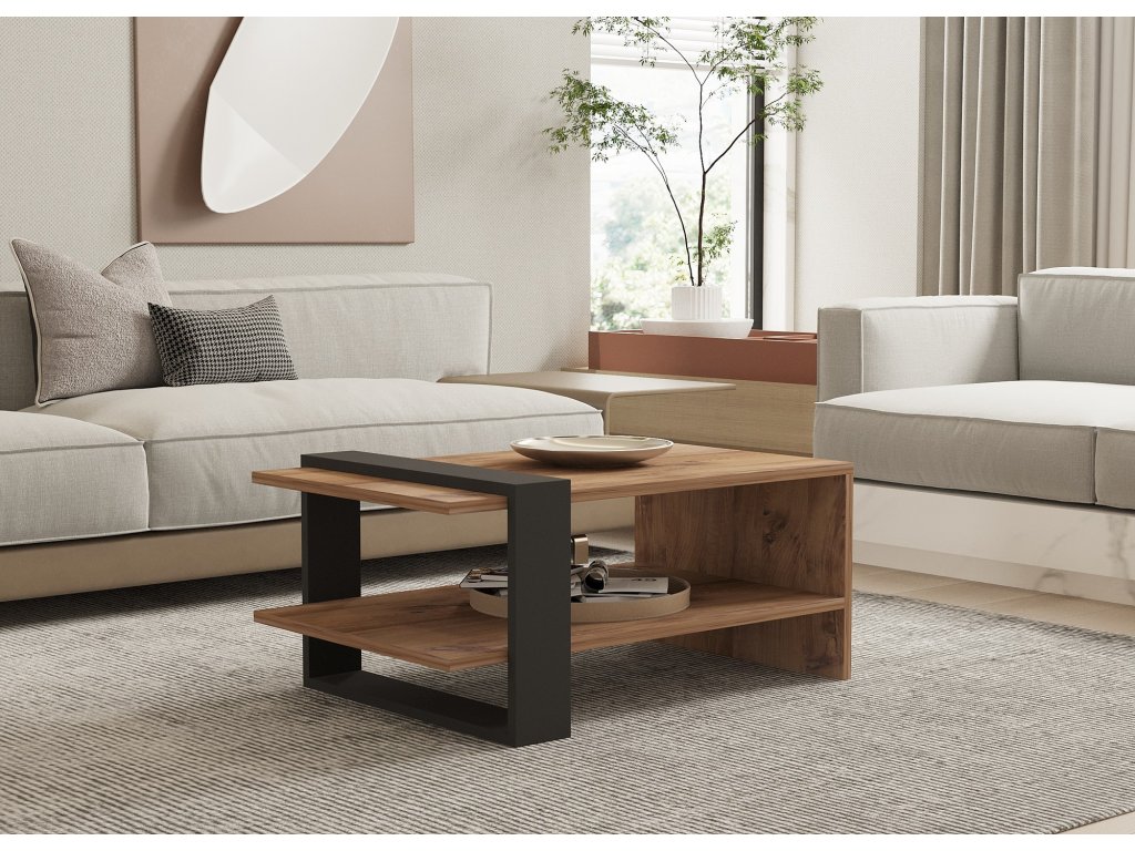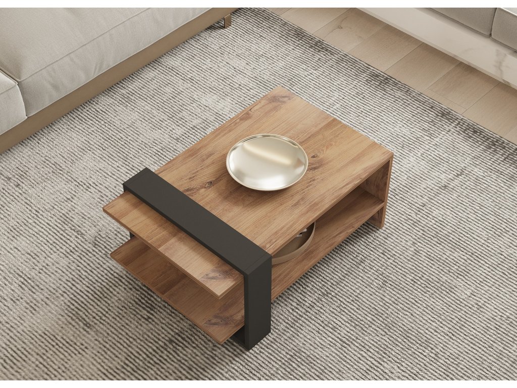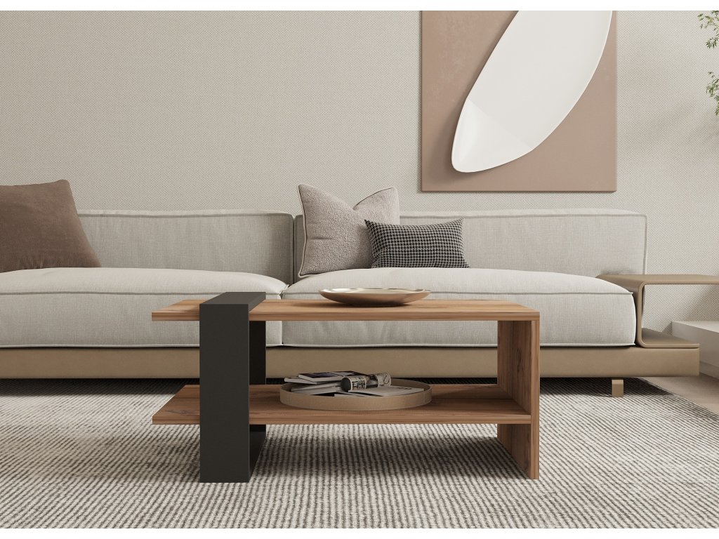 Kombinace dubové a antracitové barvy dodává tomuto konferenčnímu stolku jedinečný a industriální vzhled, díky čemuž je perfektním doplňkem jakéhokoli moderního interiéru. Jeho dvoupatrový design dodává stolku extra funkčnost a umožňuje vám snadno vystavit vaše oblíbené dekorační předměty nebo uložit nezbytnosti.