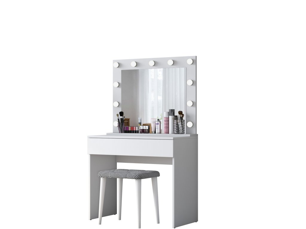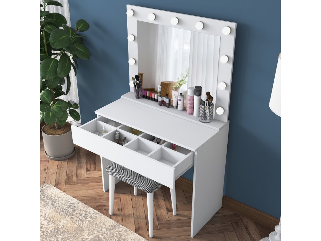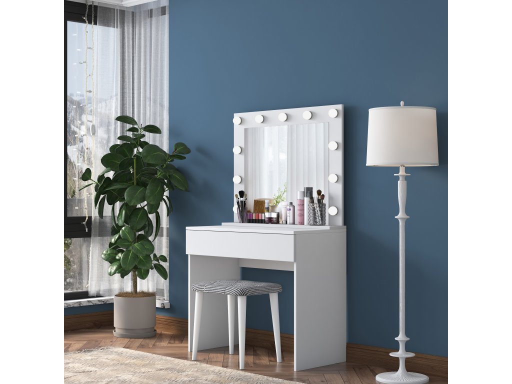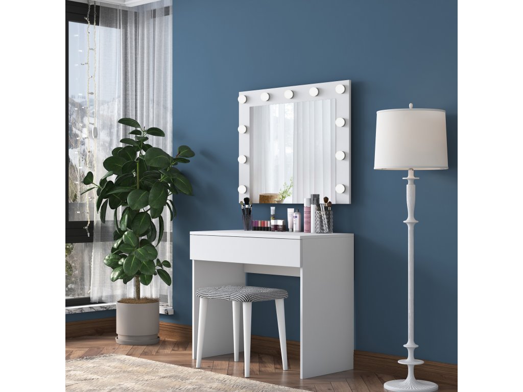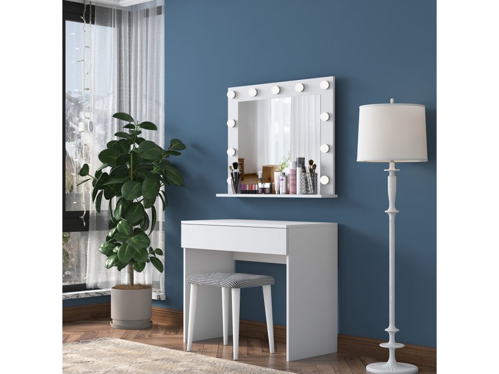 Toaletní stolek FINGER je vybaven prostornou zásuvkou pro uložení kosmetiky, šperků nebo dalších nezbytností. Velké zrcadlo poskytuje komfortní prostor pro každodenní úpravu vzhledu a součástí balení je také pohodlná taburetka, která doplňuje funkčnost a design stolku.