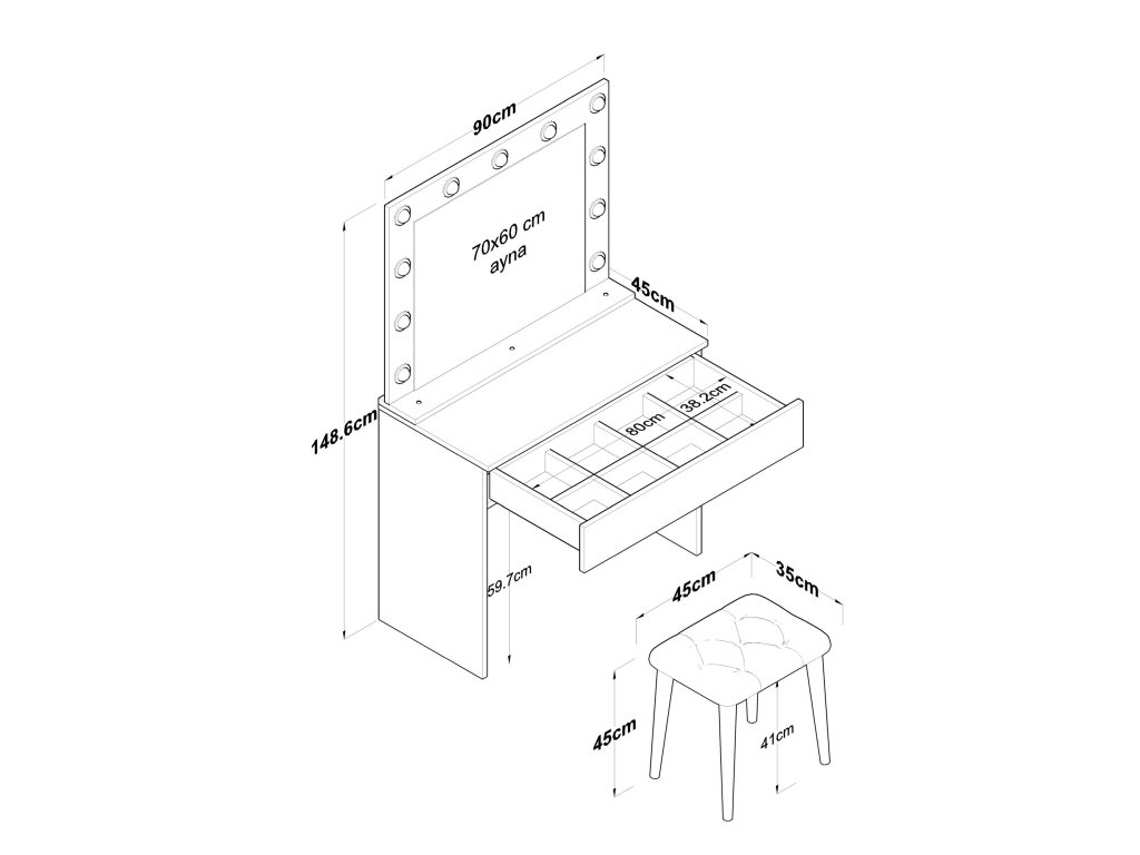- Vybavení: 1 zásuvka, zrcadlo, taburetka