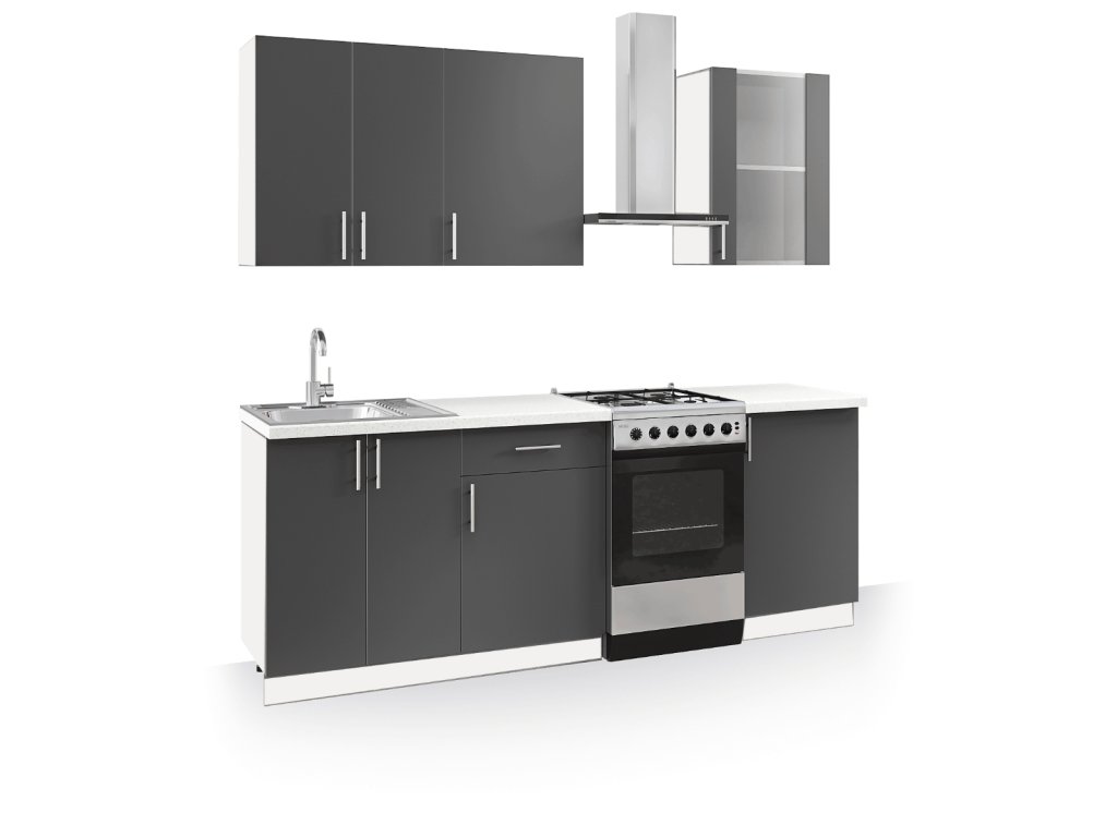 Moderní kuchyně FORESTA 160 se díky svým rozměrům vejde i do malých prostor. Barevné provedení antracit/bílá jí dodává moderní ráz, který zvýrazňují stříbrné plastové úchyty. Je vyrobena z kvalitní LTD desky nenáročné na udržování, součástí kuchyně je sokl.