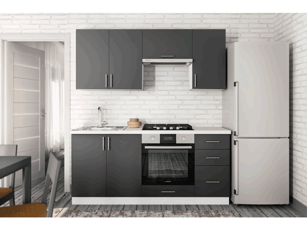 Moderní kuchyně FORESTA 180 se díky svým rozměrům vejde i do menších prostor. Barevné provedení antracit/bílá jí dodává moderní ráz, který zvýrazňují stříbrné plastové úchyty. Je vyrobena z kvalitní LTD desky nenáročné na udržování, součástí kuchyně je sokl.