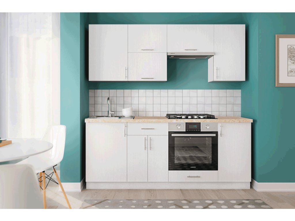 Kuchyňská linka FORESTA 200 je velmi jednoduše řešená a potěší mimořádně příznivou cenou. Barevné provedení bílé dřevo/bílá je zvýrazněno stříbrnými plastovými úchyty. Je vyrobena z kvalitní LTD desky nenáročné na údržbu a součástí kuchyně je sokl.