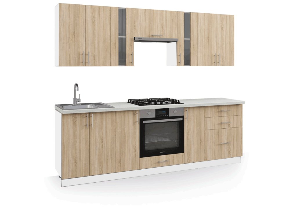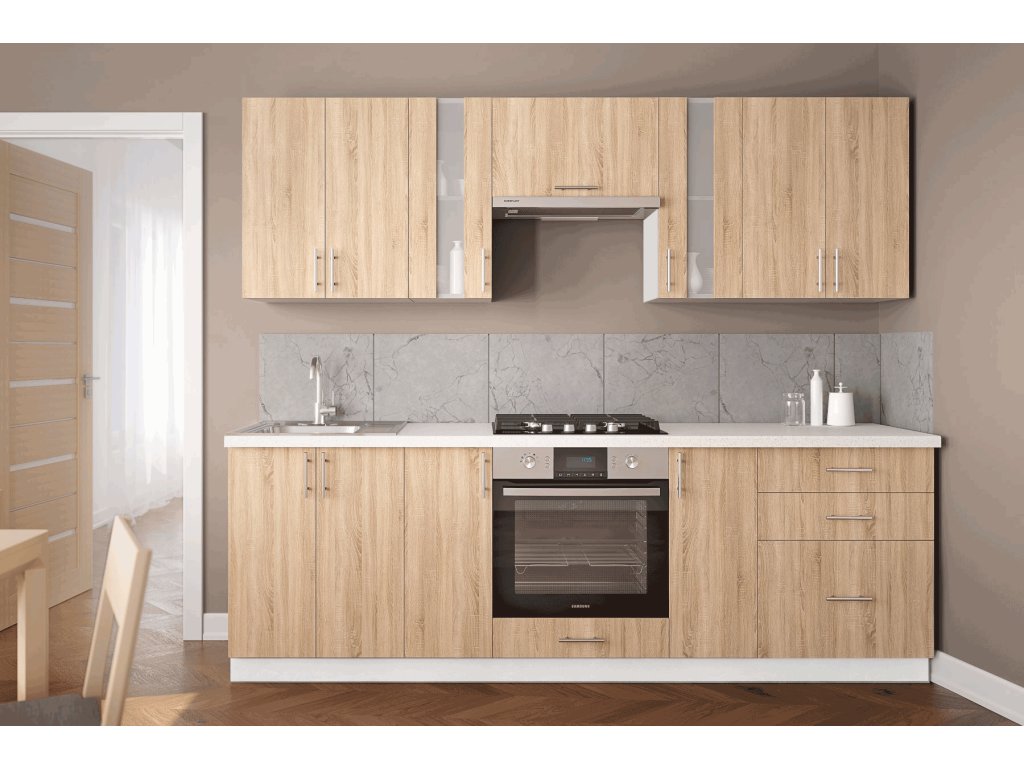 Kuchyňská linka FORESTA 240 je velmi jednoduše řešená a potěší mimořádně příznivou cenou. Barevné provedení dub sonoma/bílá je zvýrazněno stříbrnými plastovými úchyty. Je vyrobena z kvalitní LTD desky nenáročné na údržbu a součástí kuchyně je sokl.