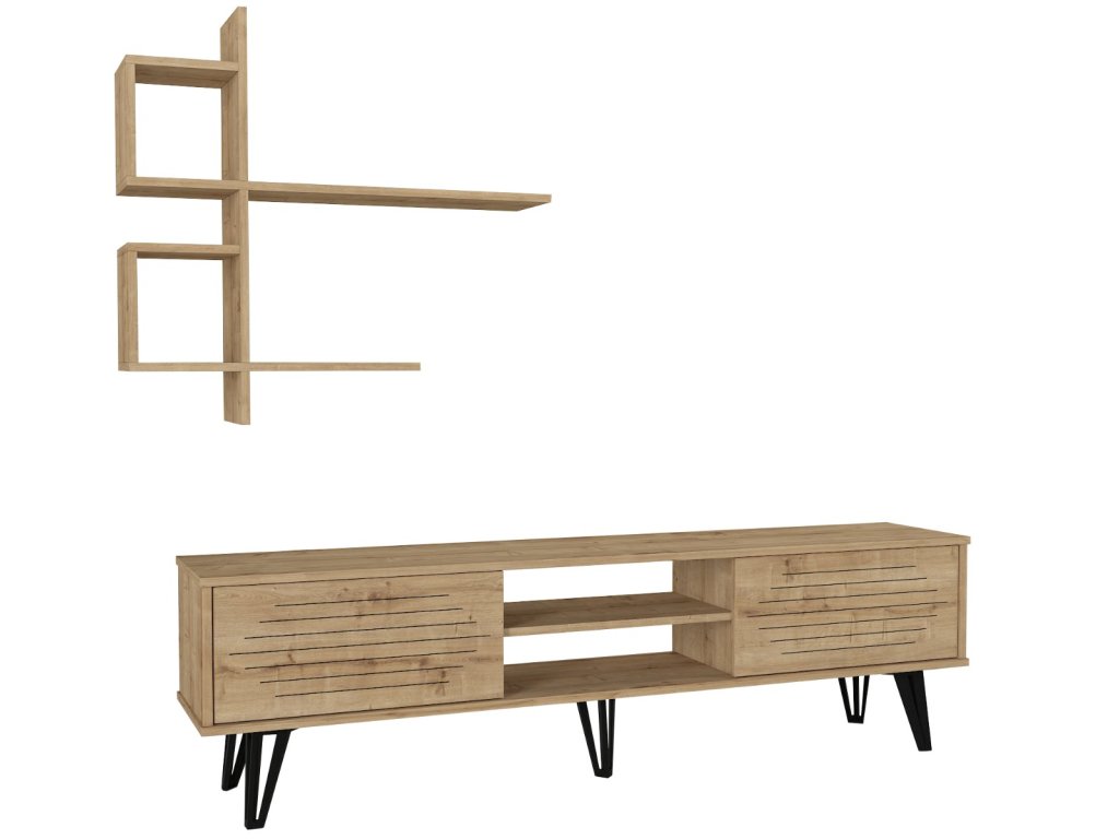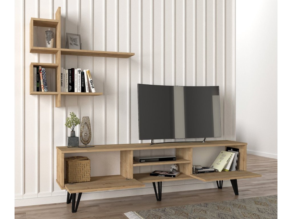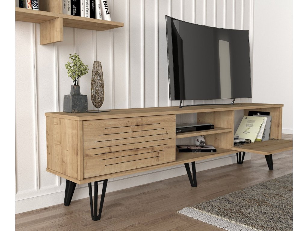 Stylový TV stolek FREDDY se díky svému přírodnímu provedení výborně hodí do interiérů laděných ve skandinávském stylu, ale také do moderního nebo loftového bydlení díky stylovým kovovým nožičkám. Je charakteristický krásnou kresbou dřeva, která je doplněna horizontálními prvky. Skříňka poskytuje dostatek úložného prostoru ve formě otevřených polic i zavřených skříněk s výklopem. Součástí TV stolku jsou také praktické závěsné police, které ideálně poslouží k vystavení dekorací či knih.