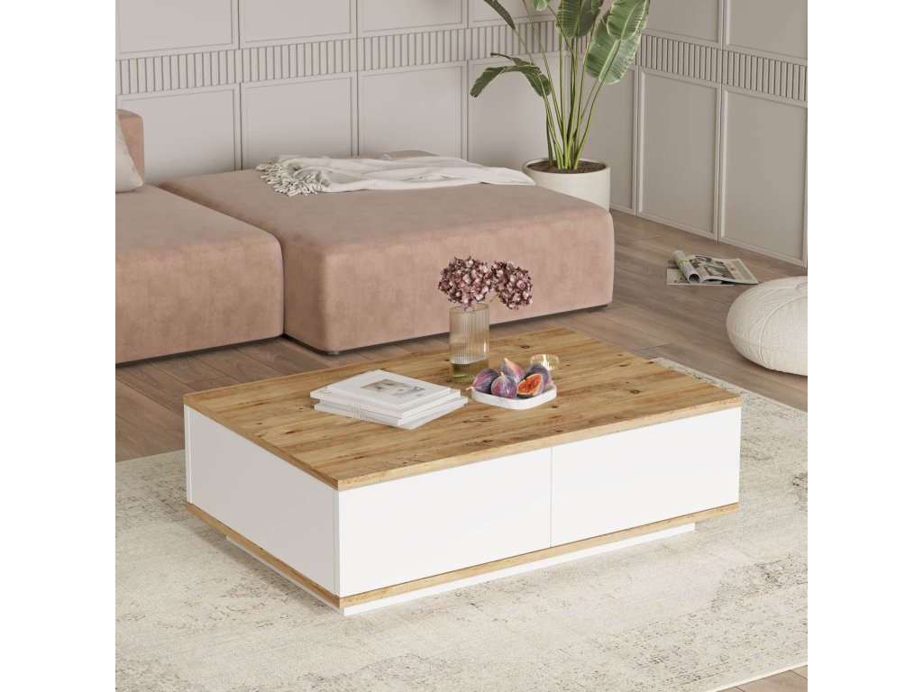 tolek Borovice a bílá spojuje estetiku s praktičností. Dvě plná dvířka poskytují uzavřený úložný prostor pro časopisy, dálkové ovladače nebo jiné drobnosti, zatímco horní plocha je ideální pro dekorace, knihy nebo občerstvení. Obdélníkový tvar zajišťuje, že stolek snadno zapadne do každého interiéru.