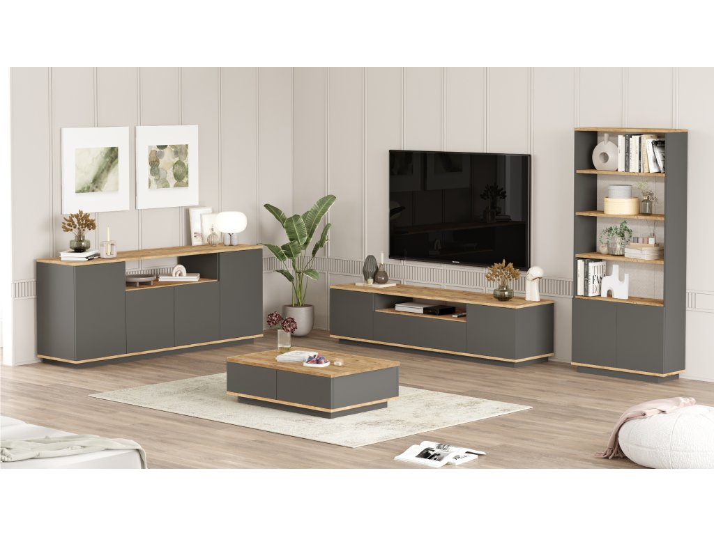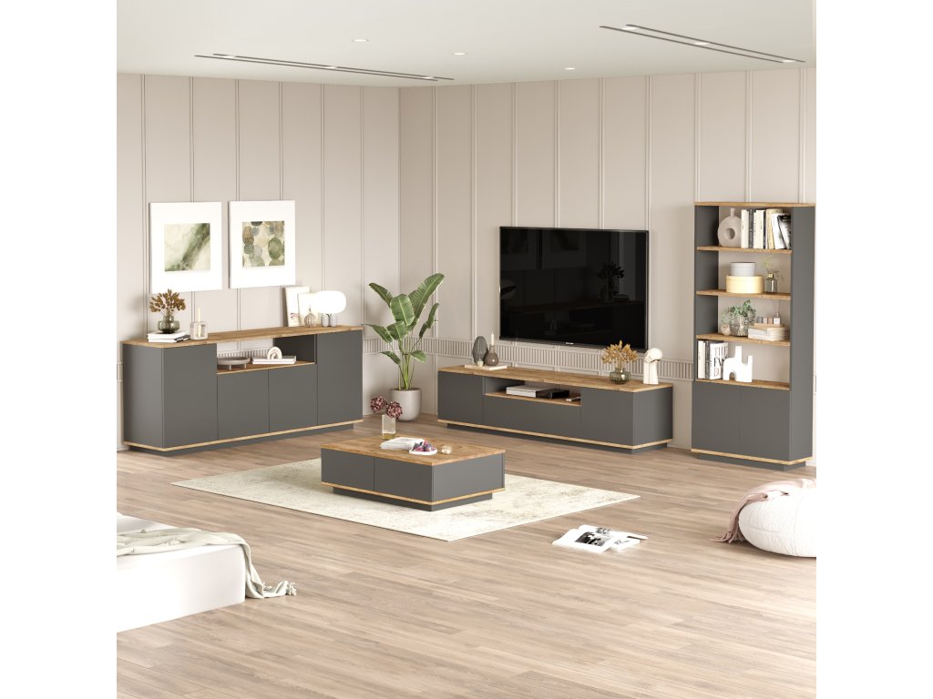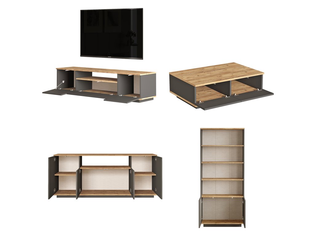Sestava zahrnuje TV stolek, konferenční stolek, komodu a knihovnu.
