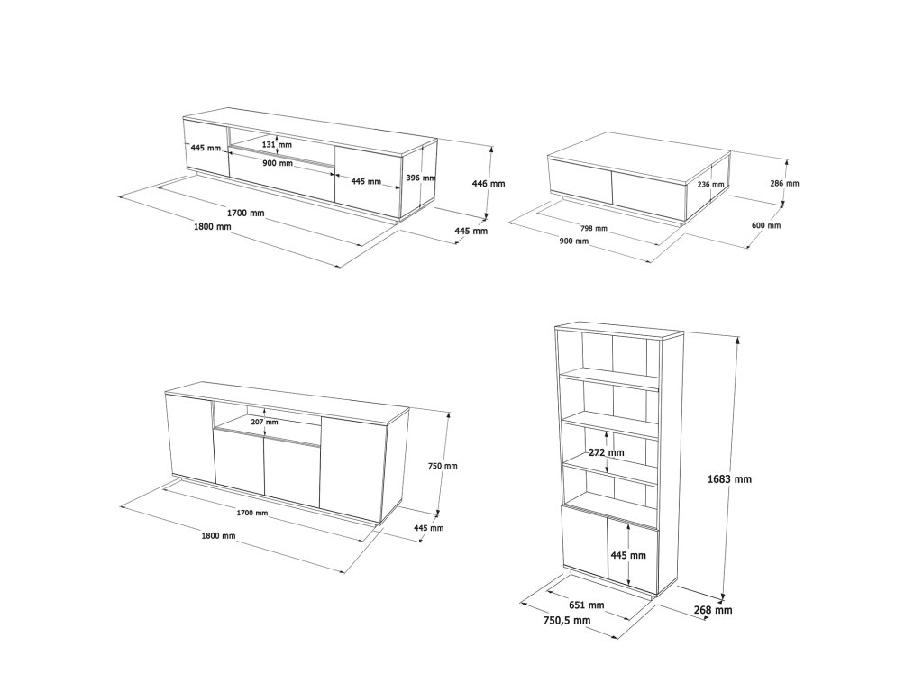 | Sestava obsahuje: | TV stolek 180x44,5x44,6cm, konferenční stolek 90x60x29cm, komoda 180x44,5x75cm, knihovna 75,26,8x168,3cm |