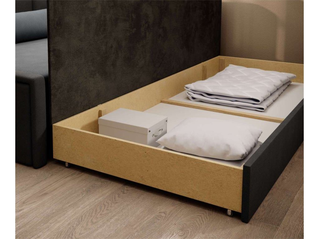 Snadná transformace a úložný prostor. Pohovka se snadno rozkládá na prostorné lůžko, což ocení každý váš návštěvník. Plastové kolečka umožňují lehký pohyb bez poškození podlahy. Vnitřní úložný prostor nabízí dostatek místa pro uložení ložního prádla nebo dalších předmětů.