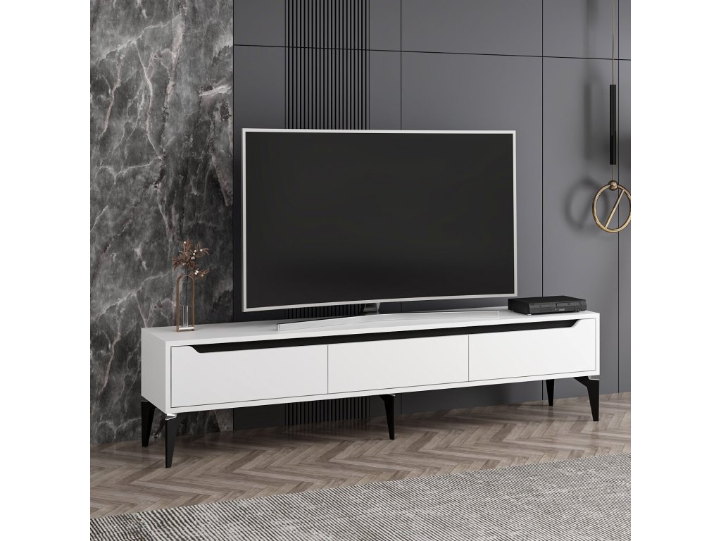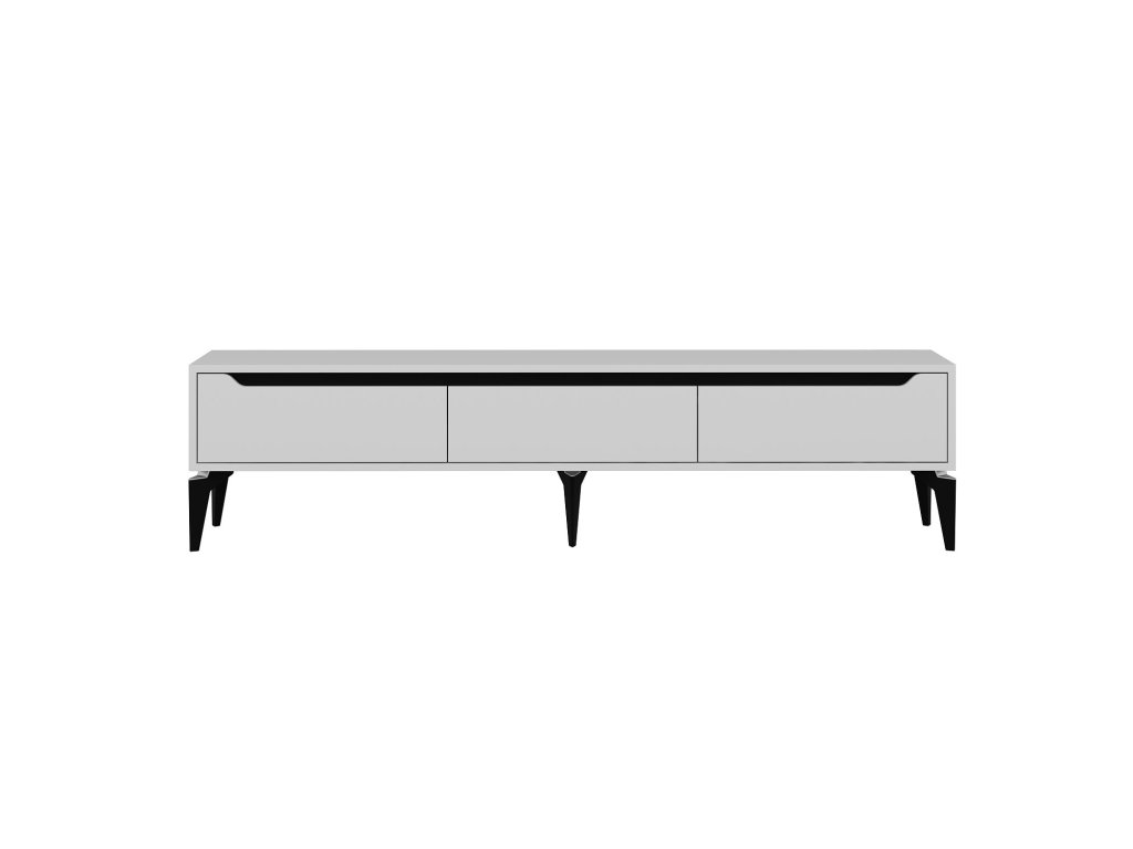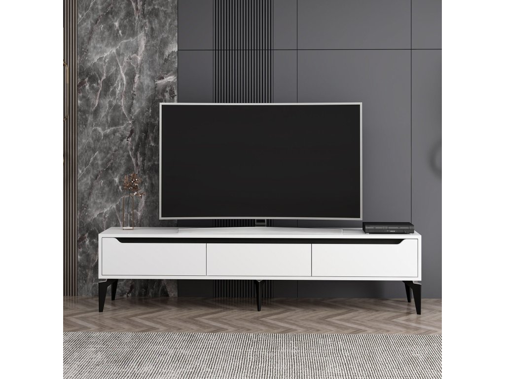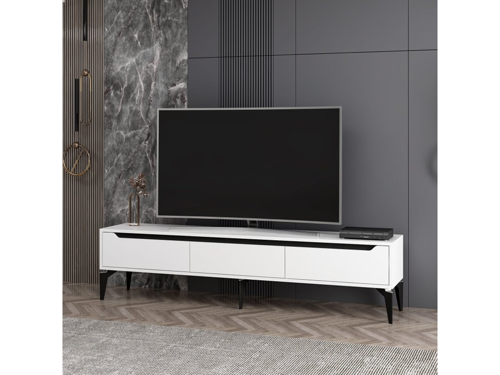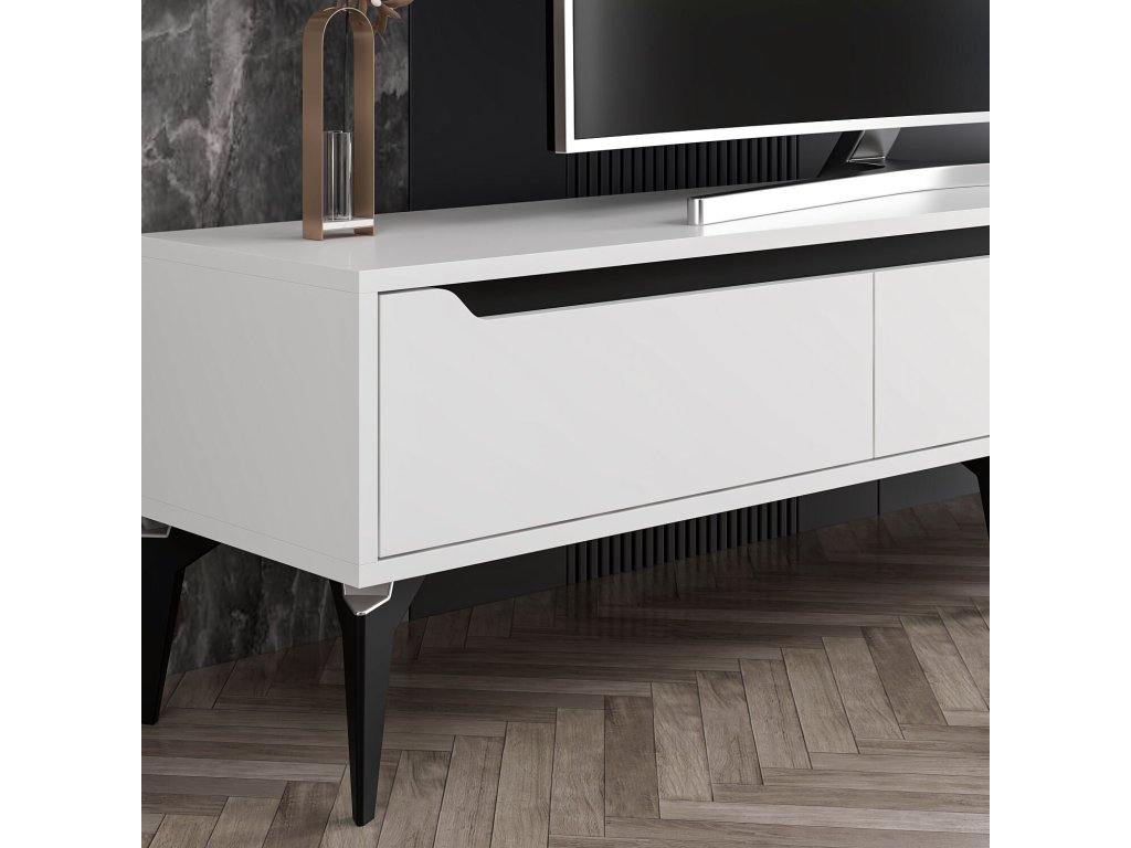 TV stolek FUN je ideální volbou pro moderní interiér. S třemi plnými dvířky nabízí dostatek úložného prostoru pro elektroniku, kabely nebo další doplňky. Kombinace bílé a černé barvy dodává stolku stylový a nadčasový vzhled, který se hodí do každého obývacího pokoje.