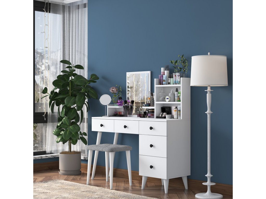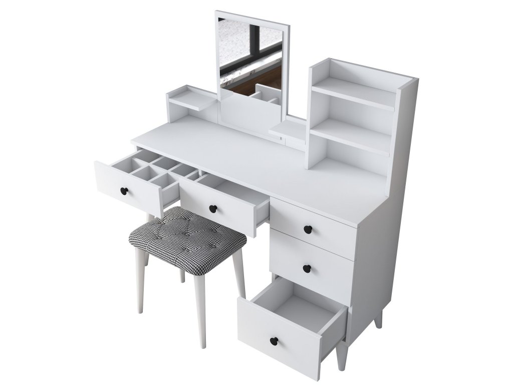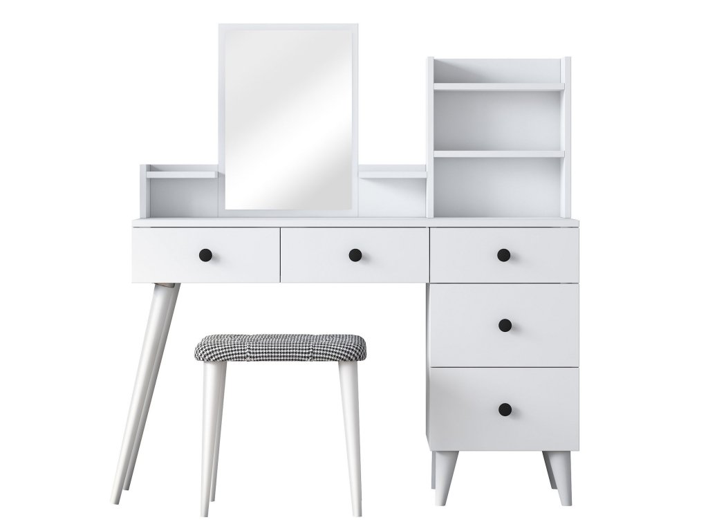 Toaletní stolek FURY je praktickým a stylovým doplňkem do každé moderní ložnice. Díky svému skandinávskému designu a čistě bílému provedení přináší svěžest a eleganci. S pěti zásuvkami, zrcadlem a pohodlnou taburetkou splňuje všechny vaše potřeby pro každodenní péči.