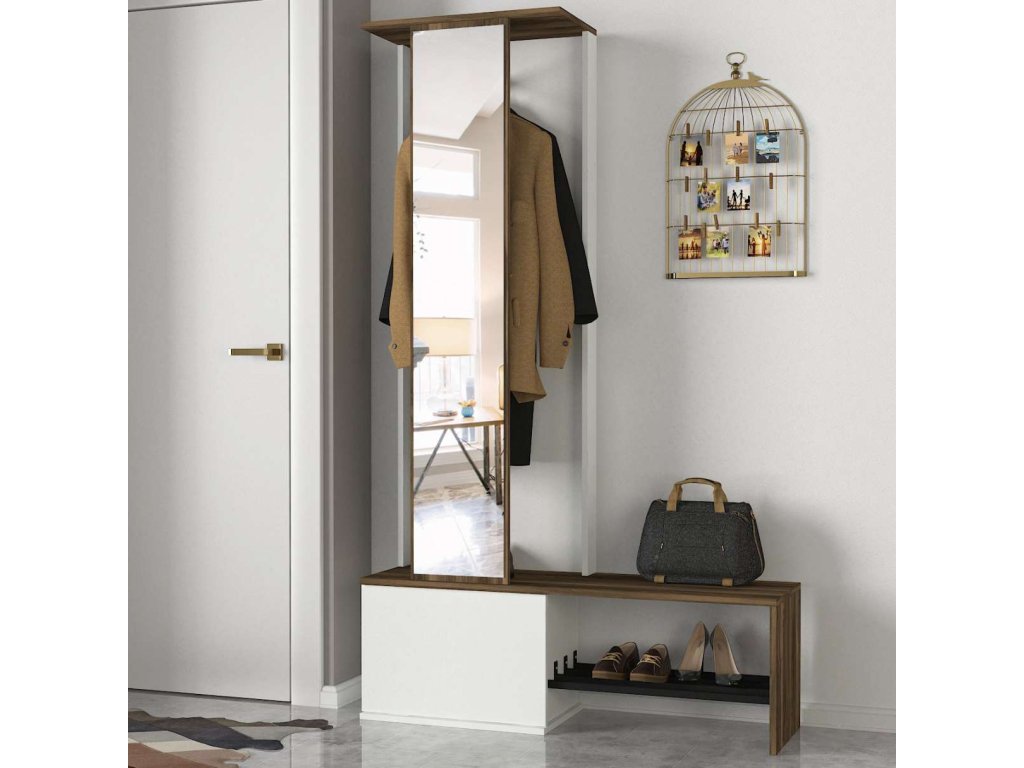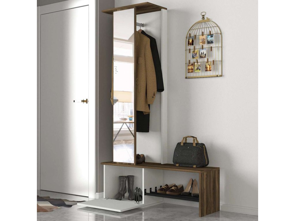 Předsíňová sestava GABRI nabízí praktické úložné řešení pro vaši předsíň díky kombinaci věšáků, zrcadla a výklopných přihrádek. Vyrobena z kvalitních materiálů LTD a skla s tloušťkou 18 mm, zaručuje dlouhou životnost a odolnost. Elegantní design v kombinaci bílé a ořechové barvy dodává sestavě moderní a přírodní vzhled, který se snadno integruje do jakéhokoli interiéru.