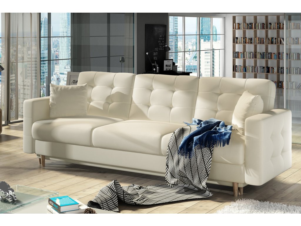 Třísedák GARD je moderním a stylovým nábytkem, vhodným do obývacího, pokoj pro hosty, ale i do dětského pokoje. GARD nabízí pohodlné sezení pro 3 osoby s praktickými područkami na obou stranách sedačky. Efektním a dominantním prvkem sedačky je prošití, které se nachází na opěrkové části ale také na bočnicích. Takto je design sedačky elegantně propojen a vytváří zajímavý celek. Nevýrazné nožičky v barvě přírodního dřeva dotváří celkový vzhled sedačky. Třísedák GARD nabízí pohodlné sezení díky kombinaci materiálů. Sedací část je vyrobena z vlnovcové pružiny a PUR pěny s tvrdostí T3030. Opěrková část je vyrobena z PUR pěny s tvrdostí T2542. Takto se dosáhne ideálního provedení pro Vaše pohodlí. Součástí trojsedáku je také praktická funkce rozkladu. Sedačku lze rozložit za pomoci DL-automatu, čímž si vytvoříte účelnou spací plochu 136 x 197 cm, vhodnou pro občasné spaní. Třísedák je čalouněný ekokůží Soft 33. Součástí sedačky jsou i estetické designové polštářky. Rozměry (š/h/v): 235 x 95 x 86 cm. Hloubka sedu: 46 cm, výška sedu: 44 cm.Doplňkové parametry
