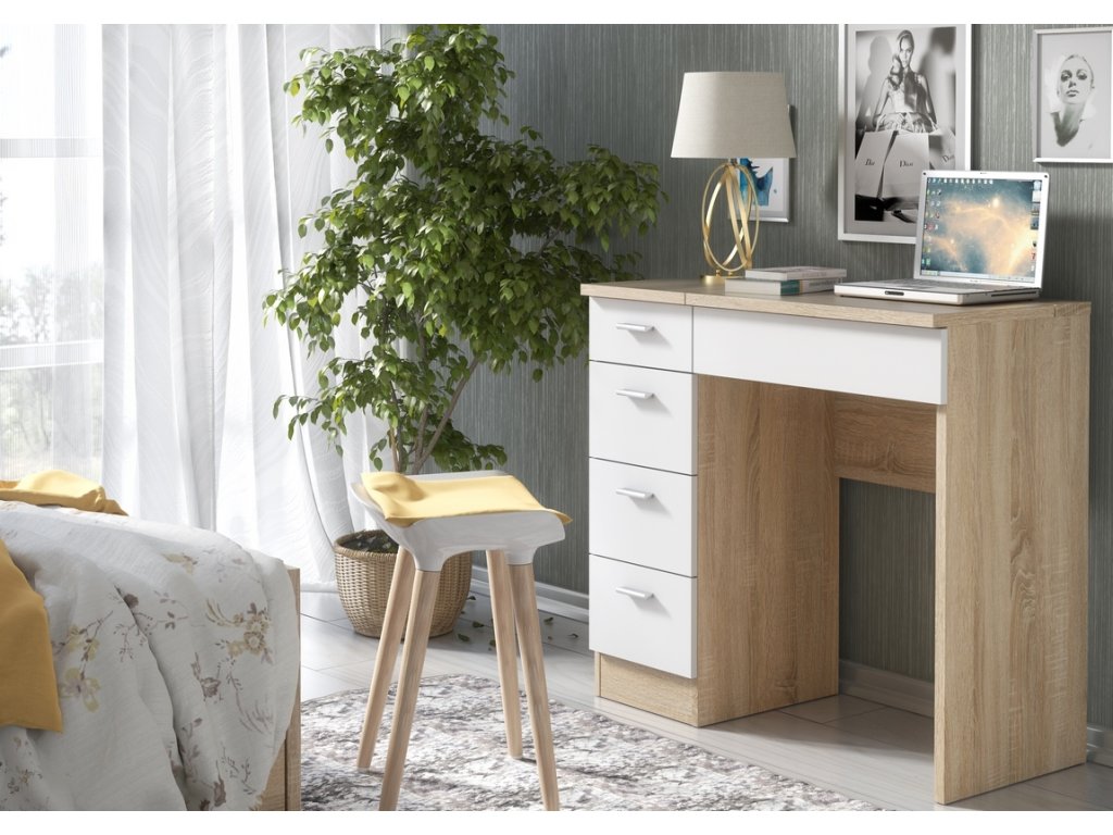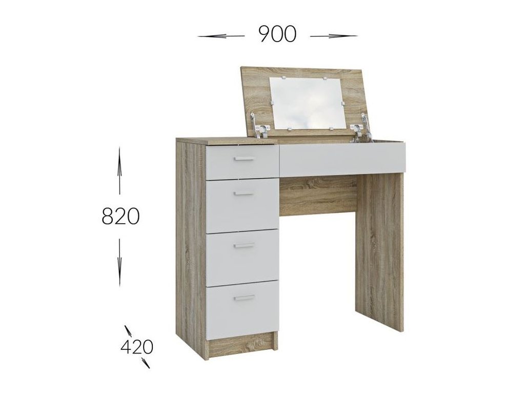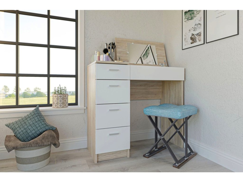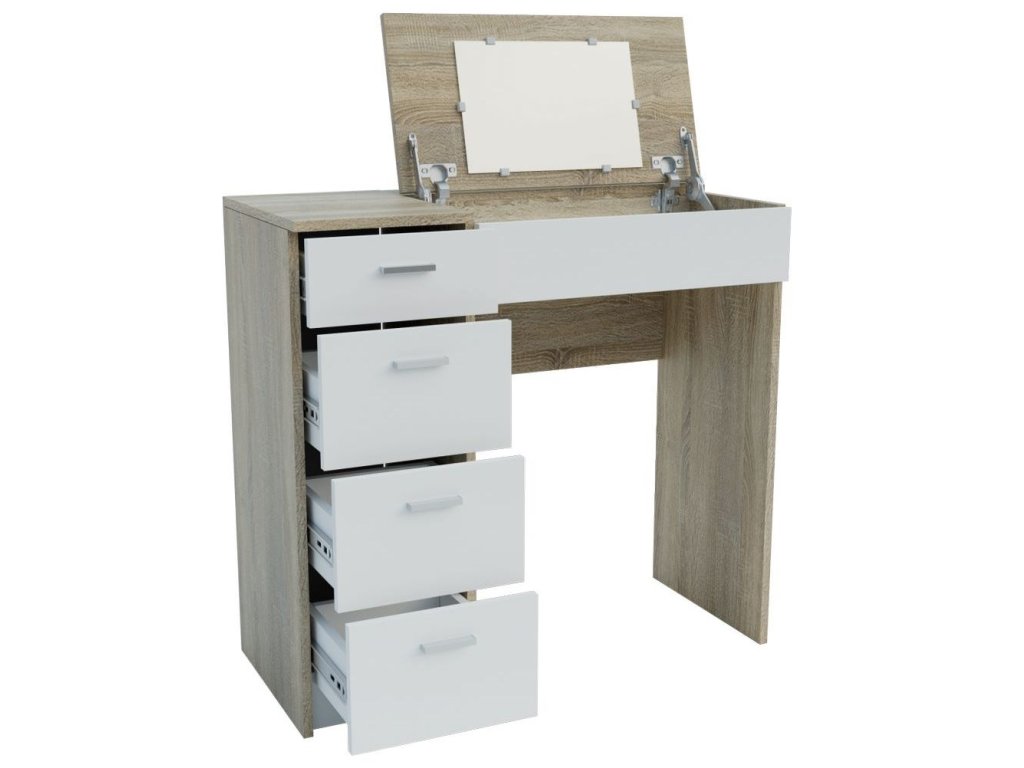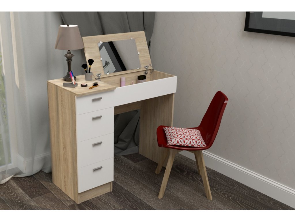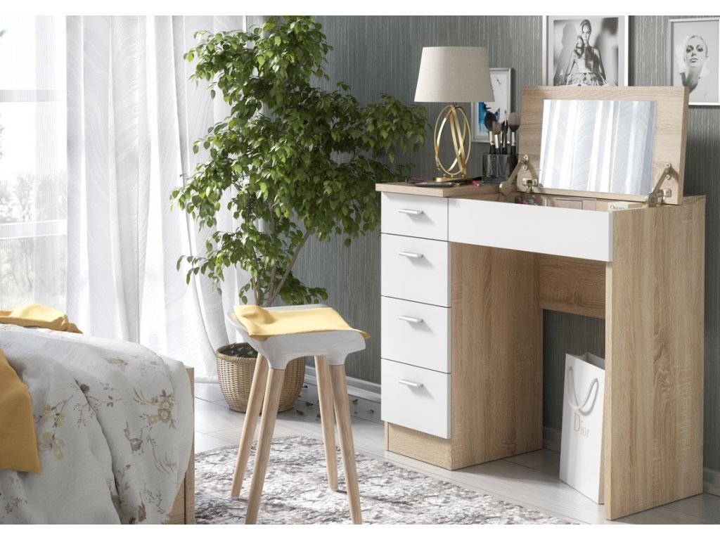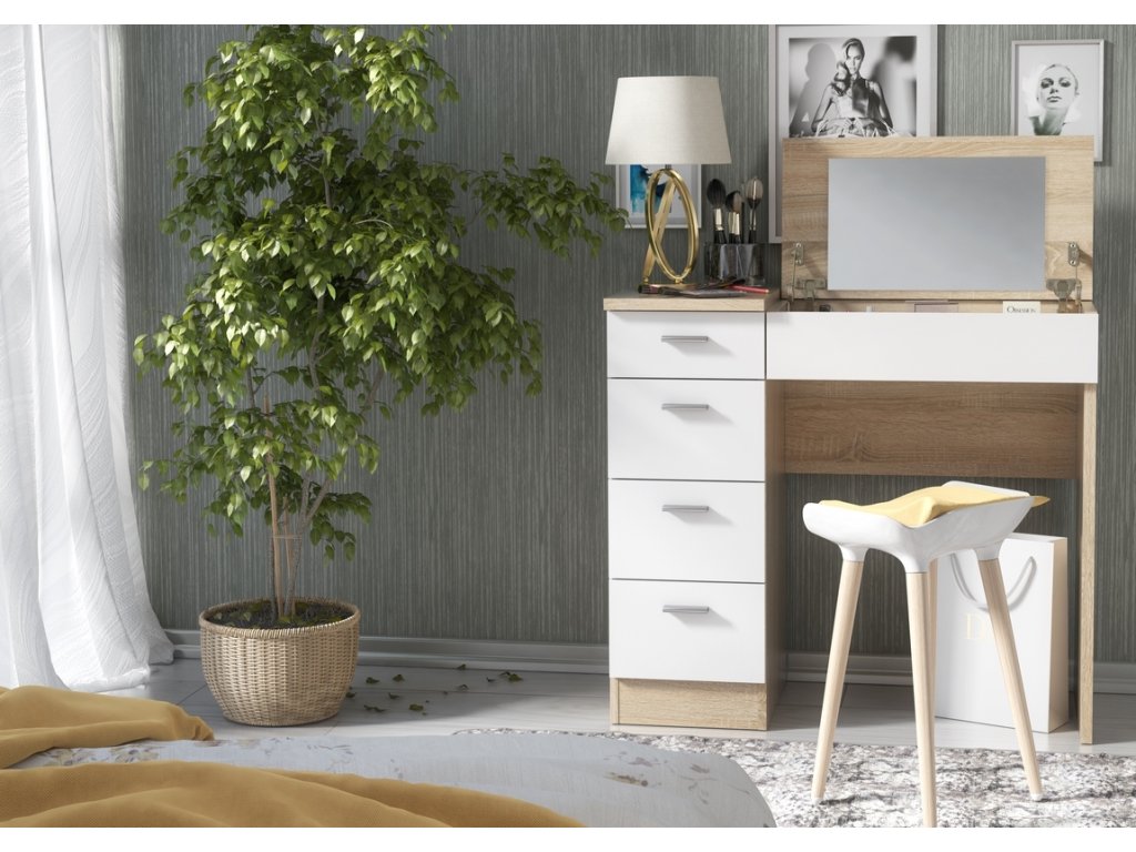 GLAMOR je netypický stolek s vícenásobným využitím. V základní poloze jej umíte využít jako klasický psací stůl. Po otevření výklopné desky se zrcadlem z něj máte za pár vteřin praktický toaletní stolek. Oceníte i více šuplíků, vhodných pro odložení různých předmětů - ať už kosmetického nebo jiného charakteru. LTD desky, která není náročná na údržbu. Barevná kombinace: dub sonoma/ bílá. Úchyty jsou plastové, v barevném provedení matný chrom. Židle není součástí.