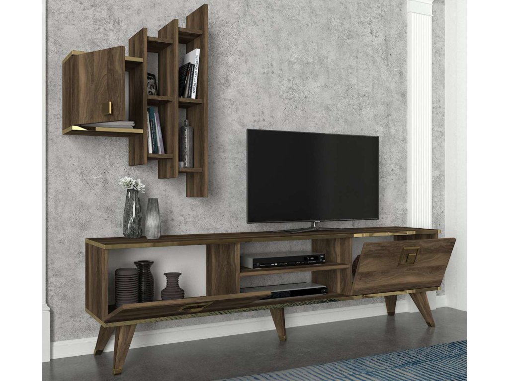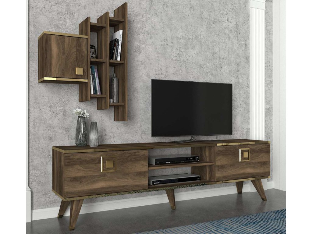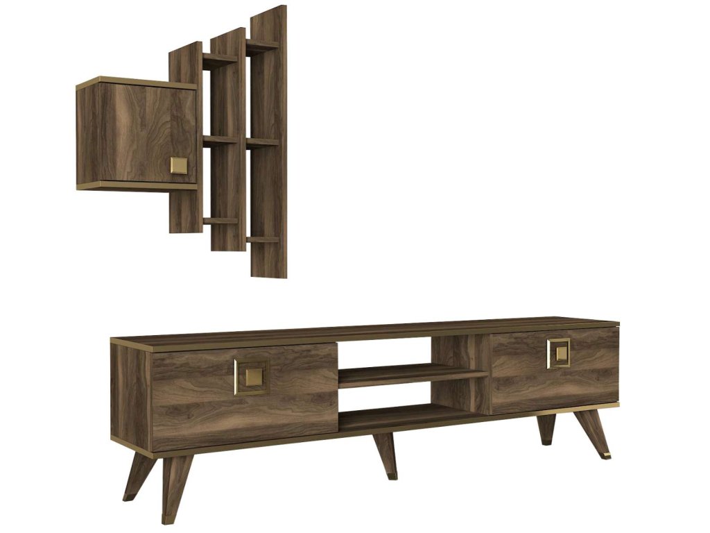 Představujeme GLASS, obývací stěnu, která přináší do vašeho obývacího pokoje eleganci a moderní design. Tato stylová sestava v ořechové barvě je navržena tak, aby poskytovala praktické a estetické řešení pro vaše multimediální zařízení a další potřeby.