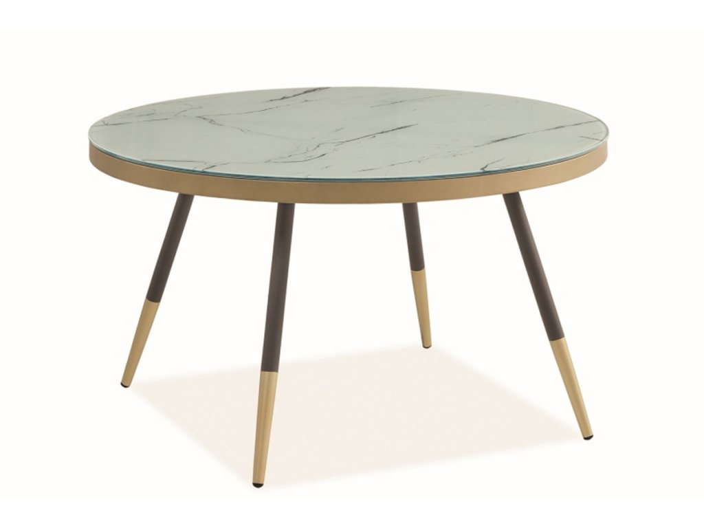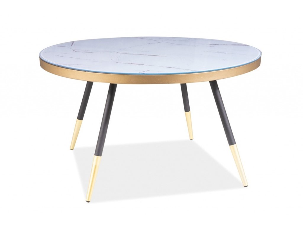 Kulatý konferenční stolek GOBI B v designovém provedení, osloví každého zastánce luxusního stylu. Moderní materiály a stylové barvy vytváří atypický designový prvek. Luxusní barvy zaručí eleganci a stylovost. Osloví Vás provedení desky stolu s efetem mramoru, která je zapracována v kruhové konstrukci. Konstrukce stolku je kovová, vrchní deska je v kombinaci přírodní dýhy a skla. Barevné provedení je v kombinaci barev bílá/černá/zlatá, přičemž horní deska je vyrobena s mramorovým efektem. Rozměry stolku (výška/průměr): 45 x 80 cm. V naší nabídce naleznete tento stolek i v menším rozměru. Dodáváme v demontu.Doplňkové parametry