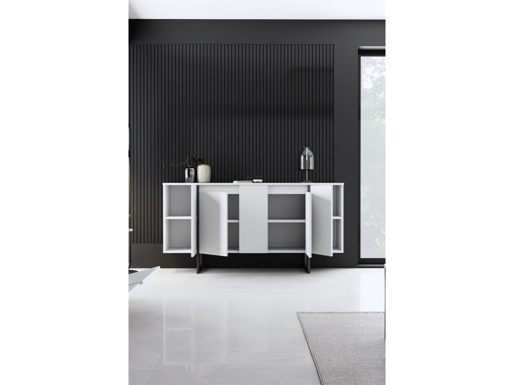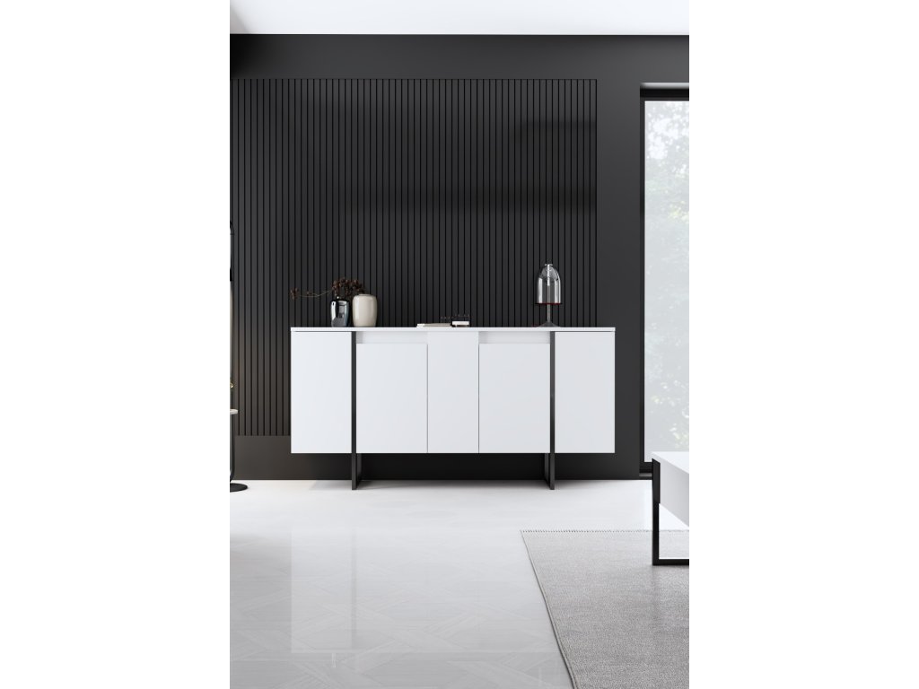 Proměňte svůj obývací pokoj nebo chodbu ve stylové útočiště s komodou. Její minimalistický design a čisté linie vytvářejí atmosféru sofistikovanosti a elegance. Kombinace bílé a černé barvy dodává nádech kontrastu, díky čemuž je všestranným kusem nábytku, který se bez problémů hodí do jakéhokoli stávajícího interiéru.