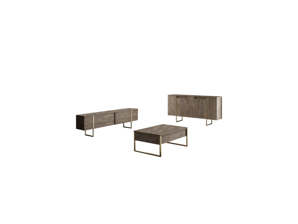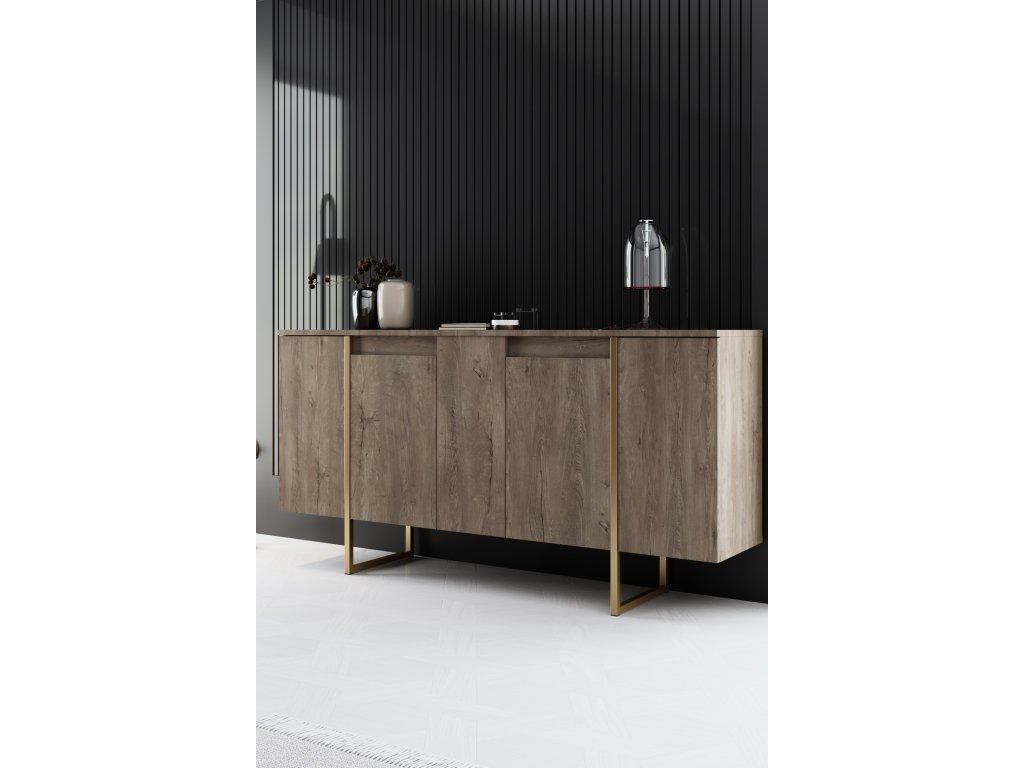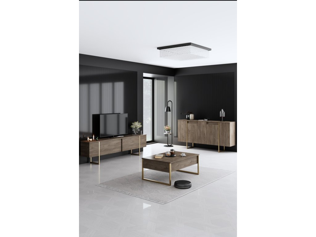 Sofistikovaný design: Kombinace barvy ořechu a zlata vytváří ohromující vizuální dojem, díky čemuž je tato komoda výrazným prvkem v každém prostoru. Její elegantní a moderní design bez námahy doplní jakýkoli styl interiéru a dodá vašemu domovu nádech luxusu.