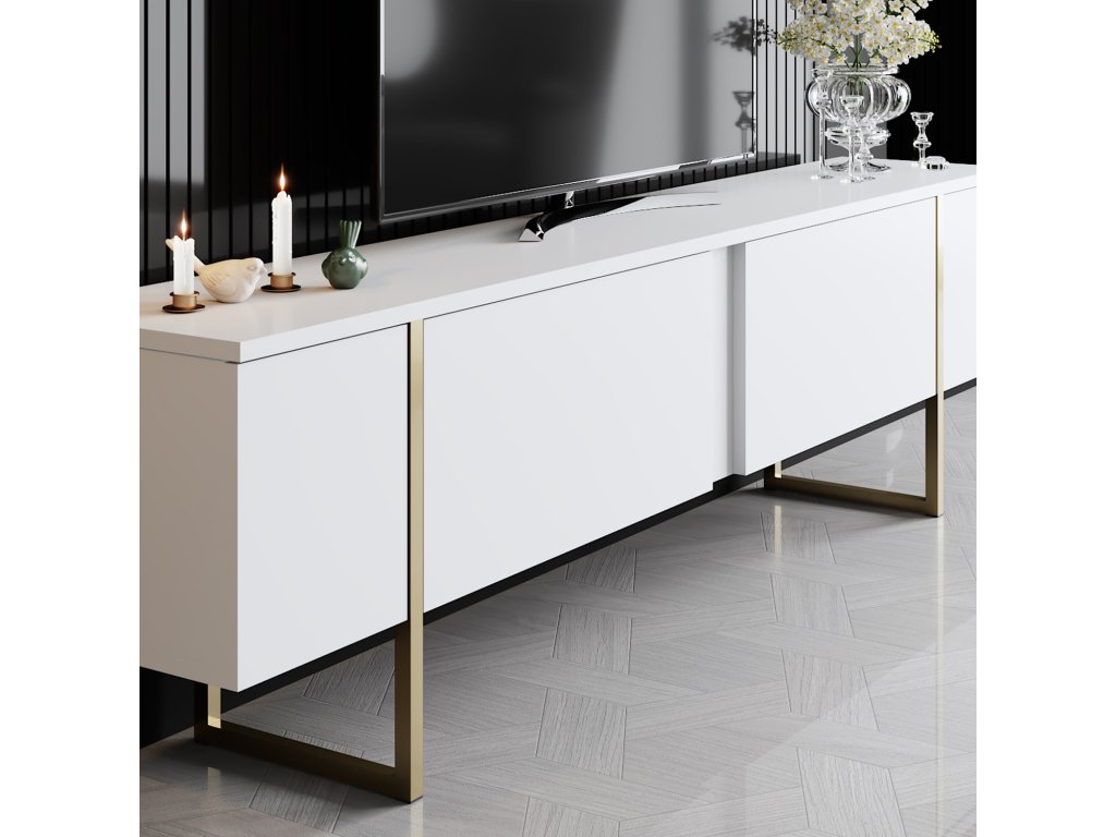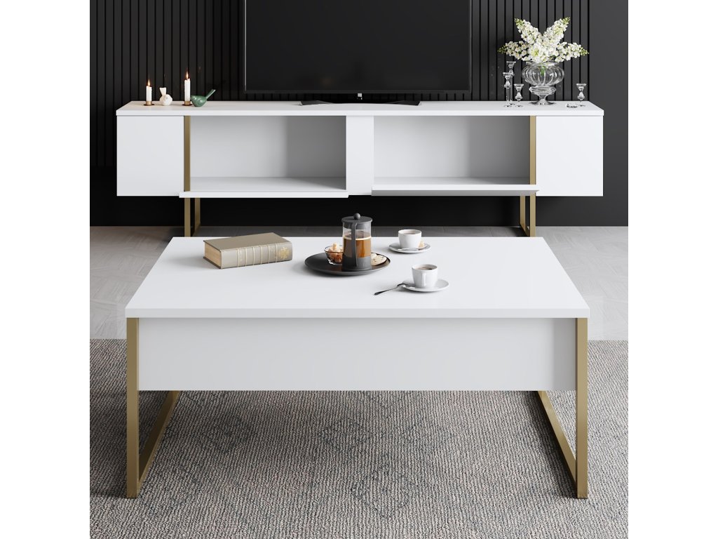 Začlenění kovových nohou dodává tomuto již tak nádhernému televiznímu stolku nádech elegance a sofistikovanosti. Elegantní zlatá povrchová úprava dokonale doplňuje bílou barvu a vytváří ohromující vizuální kontrast, který okamžitě upoutá pozornost každého, kdo vstoupí do vašeho obývacího prostoru.