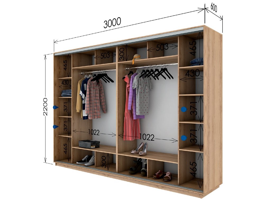 Výjimečnost skříně je v její netypické výšce až 220 cm, čímž se zajistí větší úložný prostor. Skříň je členěna na policovou a závěsnou část se 2 závěsnými tyčemi. Korpus skříně je vyroben z kvalitní LTD desky.