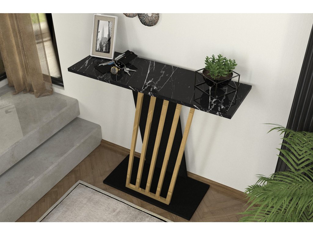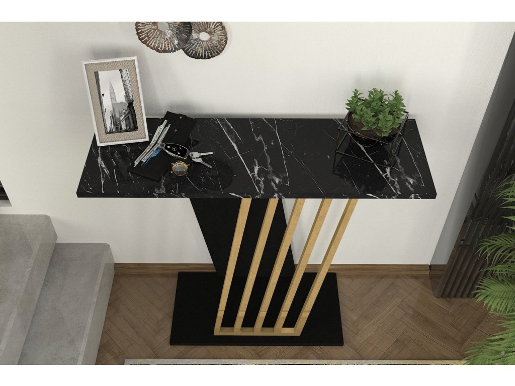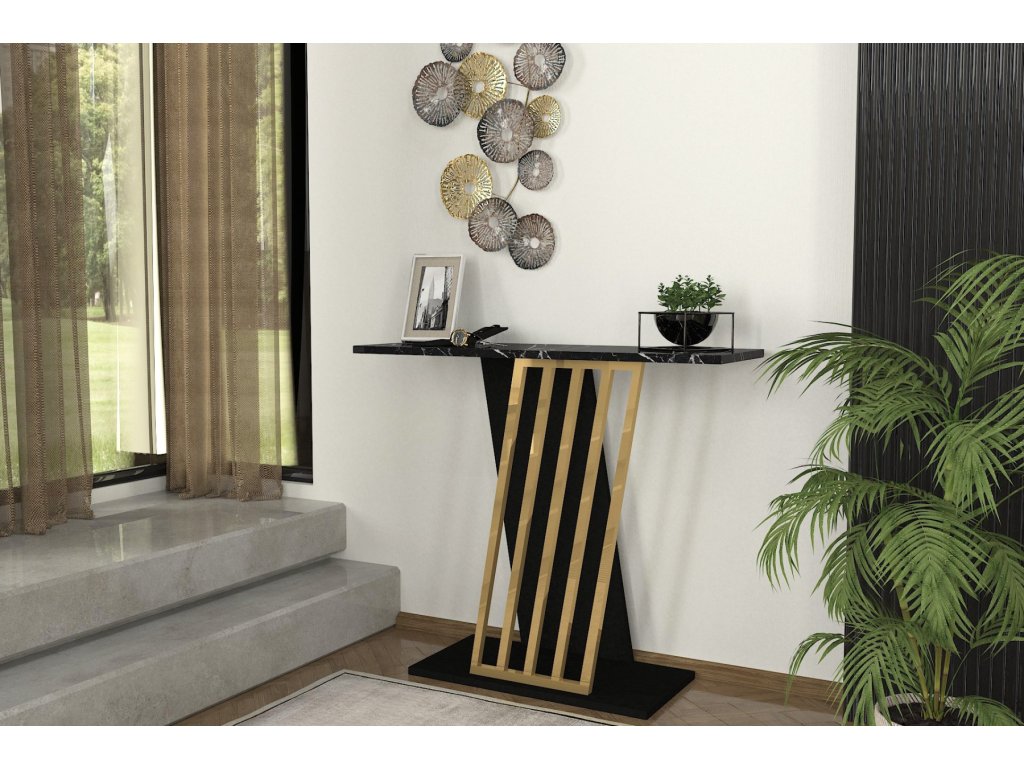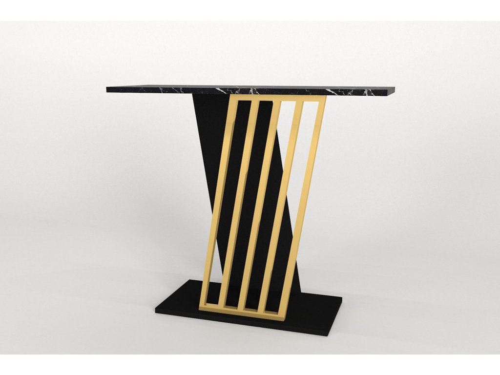 Luxusní konzolový stolek GORO ve stylu art-deco vás zajisté upoutá svým jedinečným designem. Vrchní deska je v černém lesklém barevném provedení imitující mramor. Podstava je tvořena černou deskou s nohama ve tvaru písmene X. Celkový art-deco design stolku je doplněn zlatou barvou nohy, která dokonale ladí s černou barvou. Konzolový stolek zaručeně osvěží každý interiér a bude se skvěle vyjímat zejména v luxusněji zařízených art-deco předsíních nebo halách.