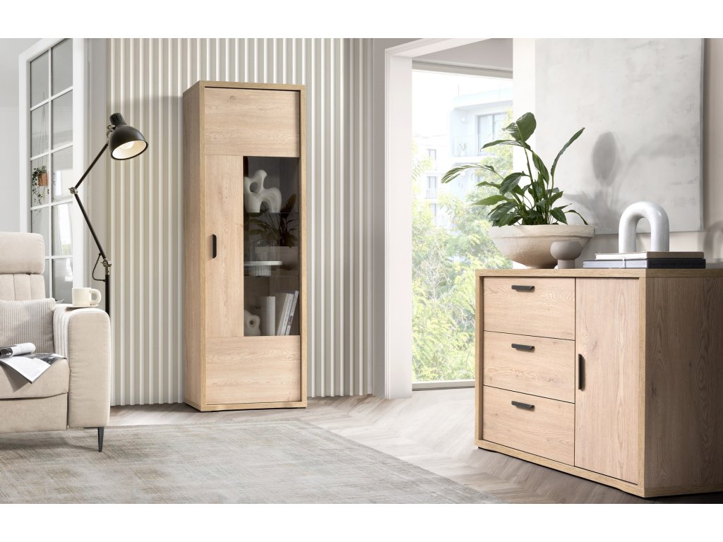 Elegantní a praktická vitrína v dekoru dub krémový přináší teplý přírodní vzhled do každého interiéru.