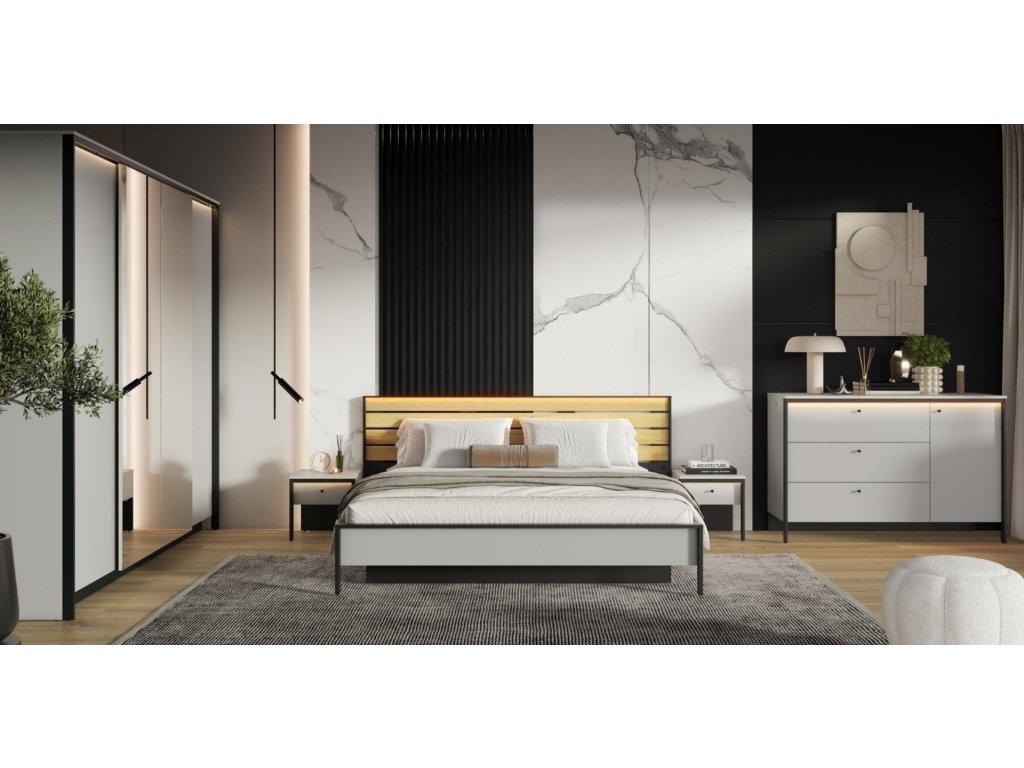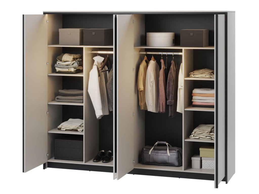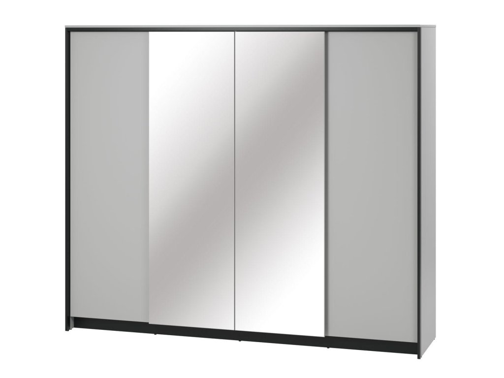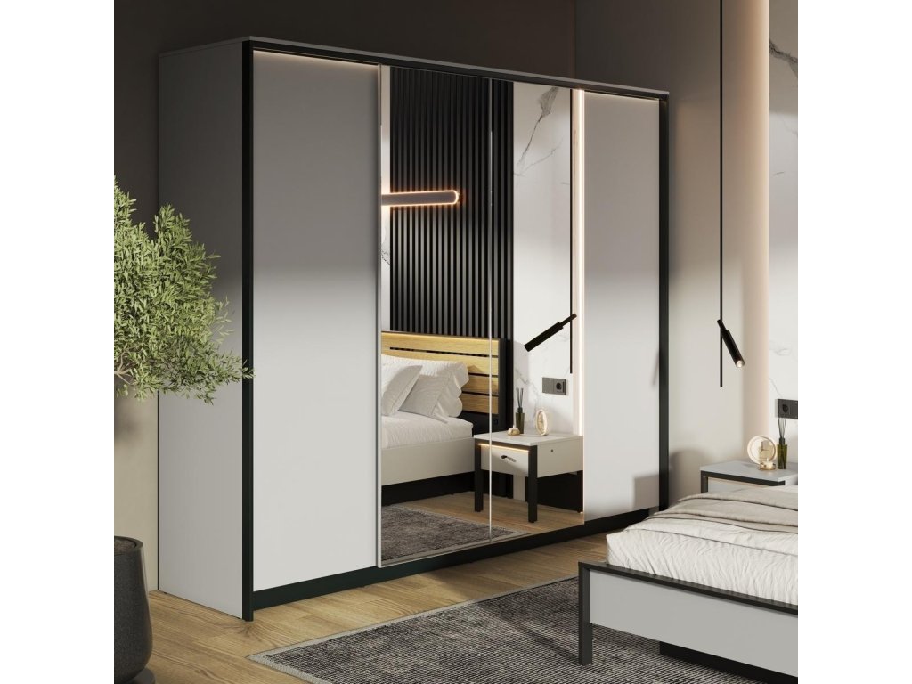 Šatní skříň čtyřdvéřová se zrcadly a osvětlení pomocí LED pásky v ceně. Kolekce je příkladem pohodlí, funkčnosti a elegantního designu. Každý kus nábytku v této kolekci je vyroben z kvalitních materiálů, které zaručují dlouhou životnost. Jemný odstín šedé s černými detaily dodají ložnici nejen výrazný charakter, ale také vytvoří ideální prostředí pro relaxaci a odpočinek. Rozměry viz obrázek. Dodáváme v demontovaném stavu.