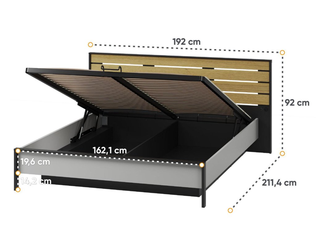 Luxusní ložnicová sestava - postel se zvedacím roštem a USB vstupem, komoda 1 dvéřová se 3 zásuvkami a 2 ks noční stolek. Rozměry viz obrázky. Nábytek je doplněn osvětlením LED páskou v ceně. Postel s úložným prostorem pod matrací (zvedací laťový rošt) je perfektní volbou pro ty, kteří ocení komfort a praktičnost. Pomocí tohoto úložného prostoru snadno uskladníte ložní prádlo, deky nebo polštáře, čímž šetříte místo ve skříni. Kolekce je příkladem pohodlí, funkčnosti a elegantního designu. Každý kus nábytku v této kolekci je vyroben z kvalitních materiálů, které zaručují dlouhou životnost. Jemný odstín šedé s černými detaily (čelo je barvy přírodní dub) dodají ložnici nejen výrazný charakter, ale také vytvoří ideální prostředí pro relaxaci a odpočinek. Vhodná matrace k dokoupení je 160x200 cm nebo 2x 80x200 cm. Dodáváme v demontovaném stavu.