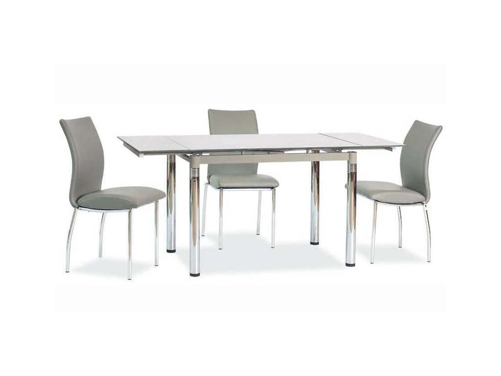 Rozkládací jídelní stůl GT-018. Stůl se rozkládá jednoduchým vysunutím dvou bočních částí zpod vrchní desky. Kombinace chromu a šedého tvrzeného skla. Tento stůl je vhodný pro 6 osob. Rozměry (výška/šířka/hloubka v cm): 74/110/74, po rozložení má stůl rozměr 74x170 cm. Na obrázku je stůl vyobrazen se židlemi H-503, které také naleznete v naší nabídce. V nabídce naleznete také stůl v béžové, fialové a černé barvě. Dodáváno v demontu.Doplňkové parametry