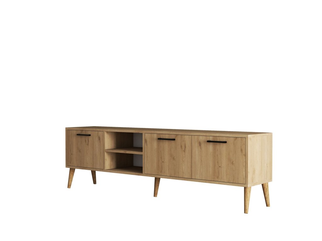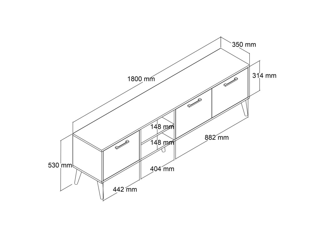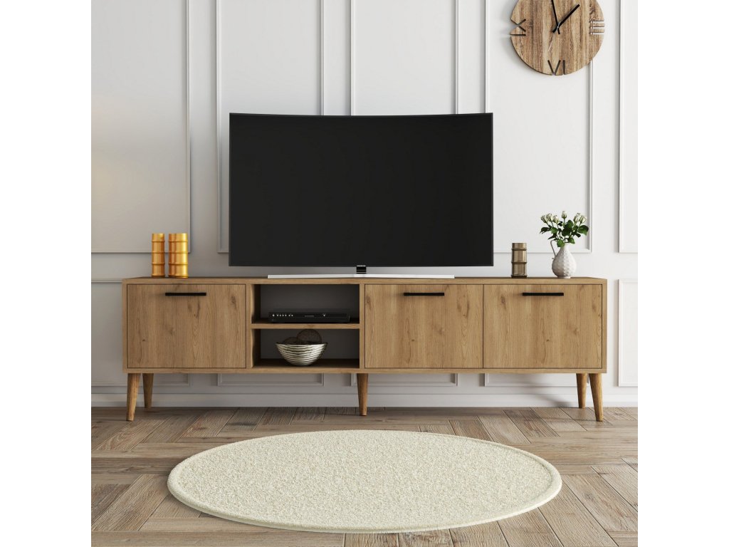 Náš televizní stolek je vyroben ze 100% dřevotřísky s melaminovým povlakem a je navržen tak, aby vydržel. Tloušťka 18 mm zajišťuje výjimečnou pevnost a stabilitu, díky čemuž odolá zkoušce času. Dřevěné nohy dodávají nádech sofistikovanosti a zároveň poskytují vynikající oporu pro váš televizor a další mediální zařízení.