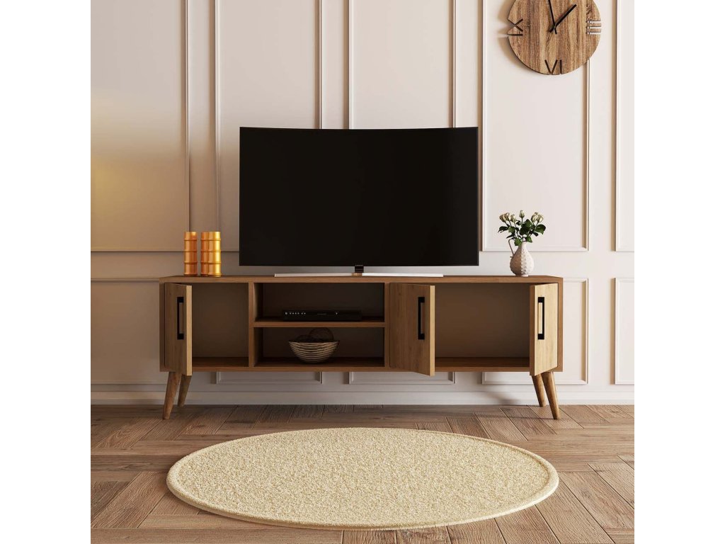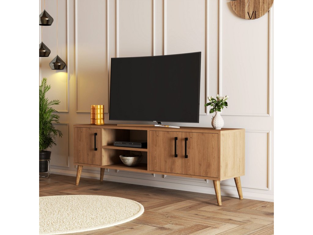 Tento televizní stolek je vyroben ze 100% dřevotřísky s melaminovým povlakem a pyšní se výjimečnou odolností a dlouhou životností. Jeho tloušťka 18 mm zajišťuje robustní konstrukci, která odolá zkoušce času. Dřevěné nohy dodávají nádech sofistikovanosti, zatímco dubová barva vyzařuje pocit tepla a elegance.